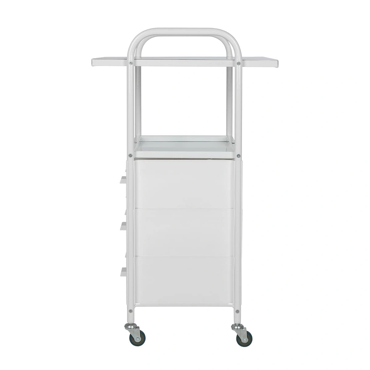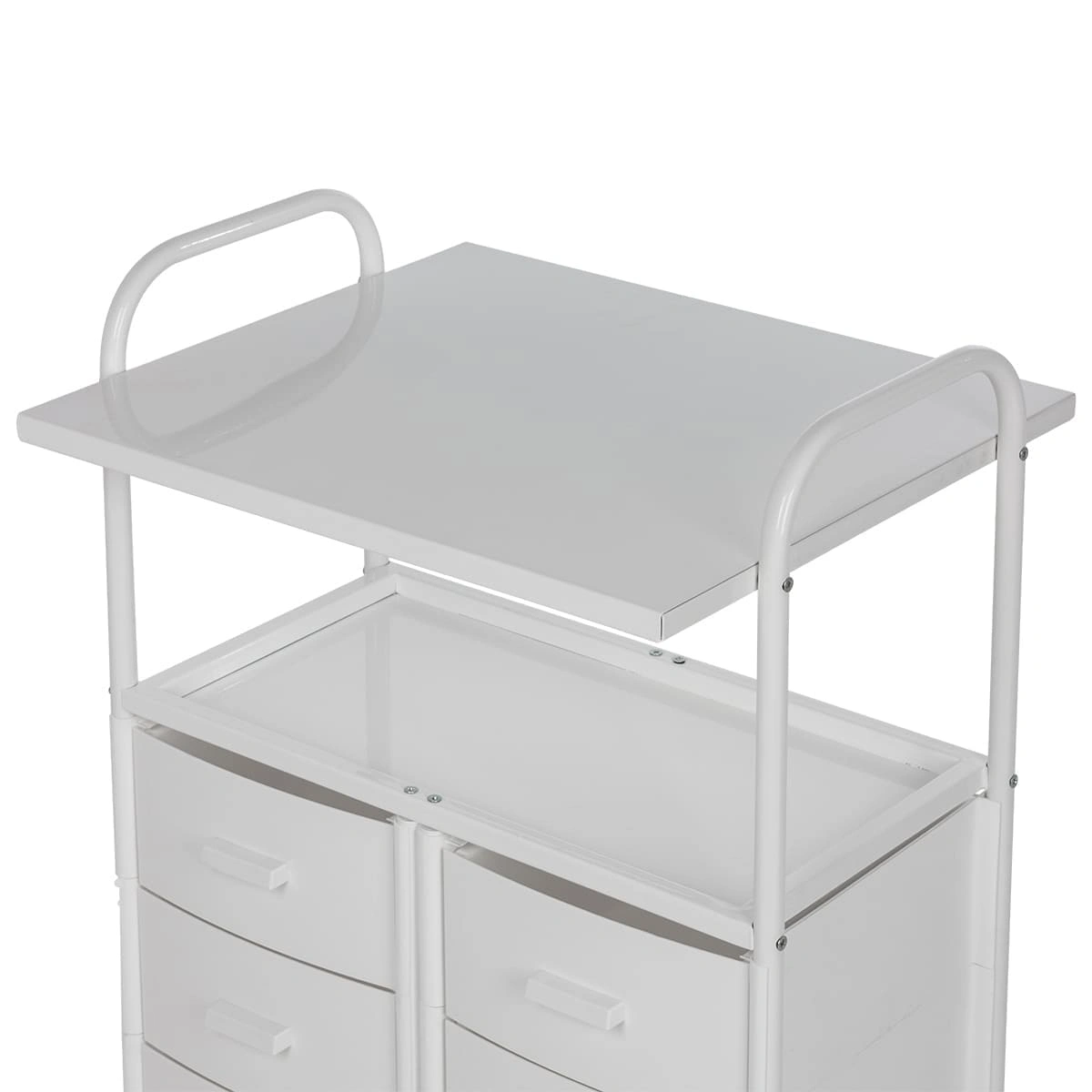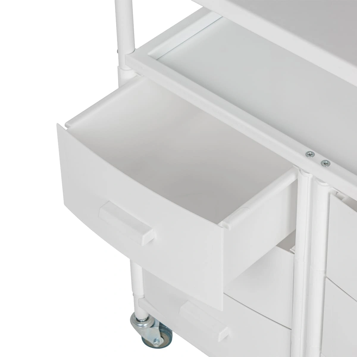 Каркас выполнен из прочного металла, поэтому косметологическая тележка выдержит на себе огромную загруженность инструментами и разными приспособлениями. Боковые панели и ящики изготовлены из ударопрочного пластика. Для полок использованы цельные металлические листы. Для защиты от коррозии и влаги поверхности металла защищены специальной краской. Материал прекрасно переносит чистку моющими и дезинфицирующими средствами.