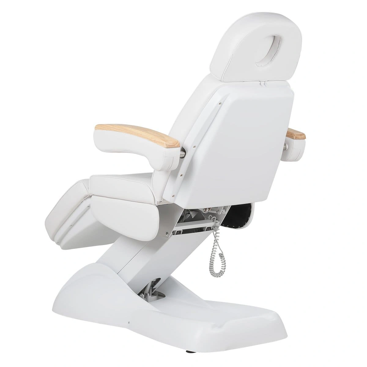 Кресло полностью раскладывается в горизонтальное положение, имеются подголовник с отверстием для лица и съёмные подлокотники со стильными деревянными вставками. Модель можно использовать для различных процедур: наращивание ресниц, педикюр, косметология, оформление бровей и т.д.