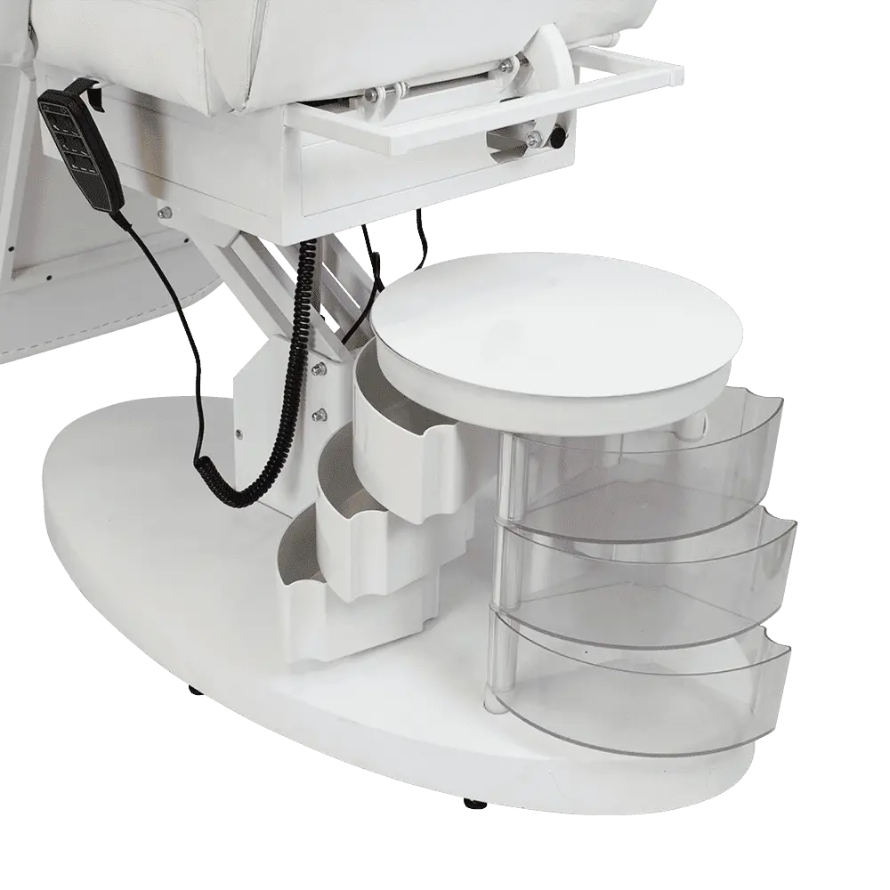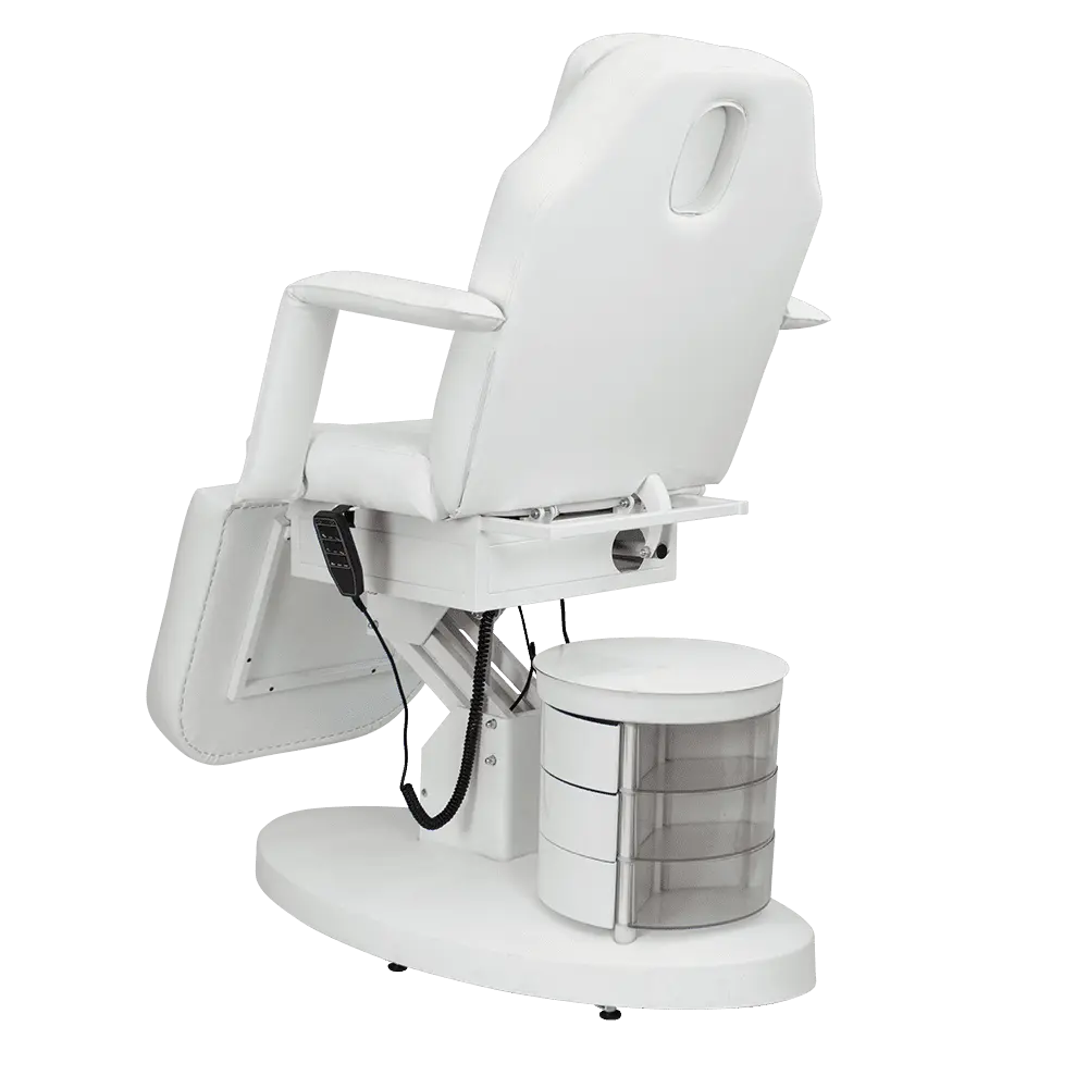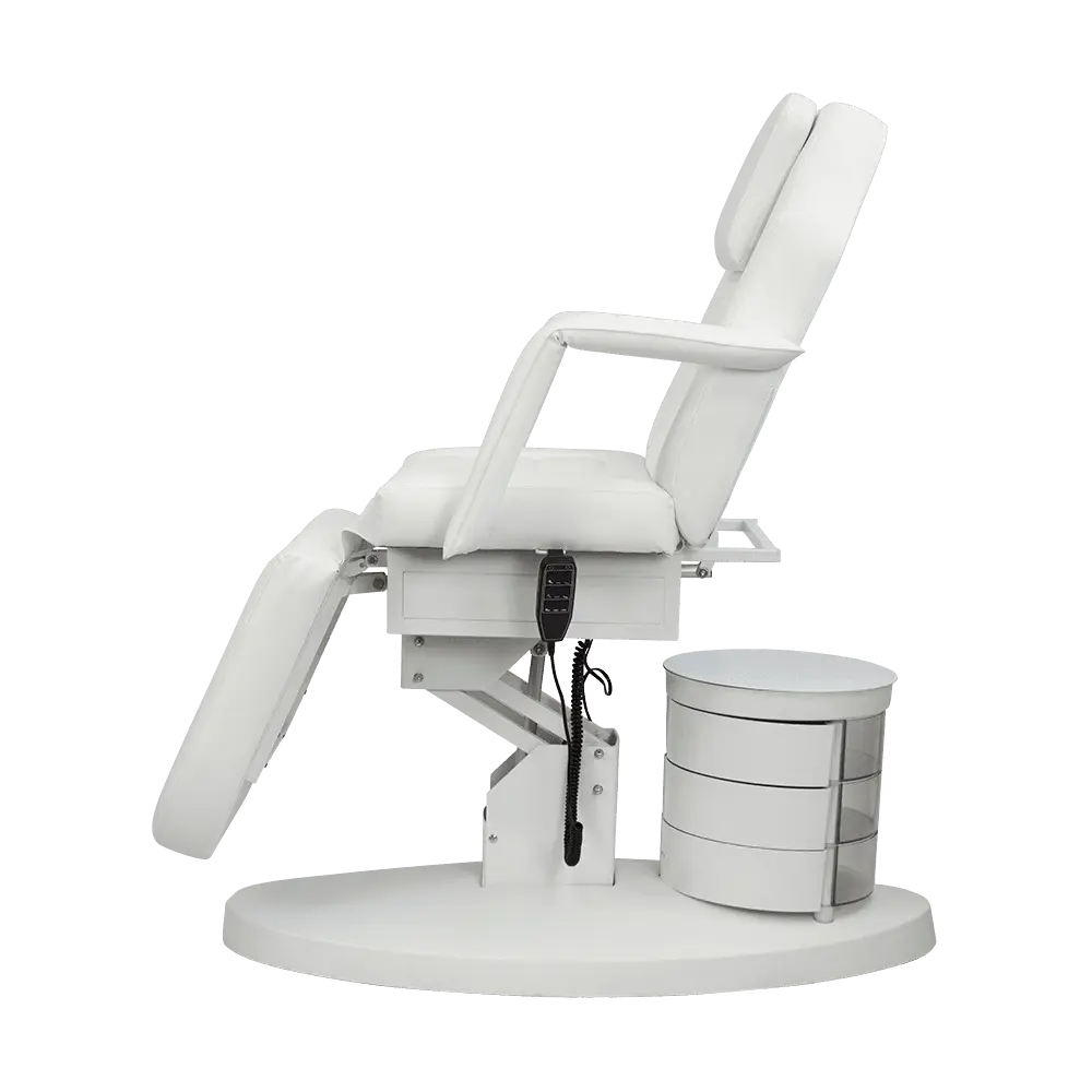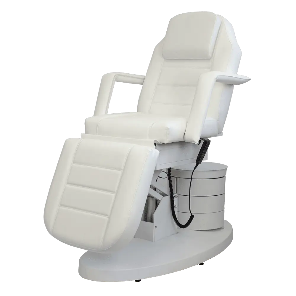 Большое и комфортное кресло имеет три мотора, отвечающих за одну подвижную часть. Данные регулировки позволяют подобрать оптимальное положение для клиента. Если есть необходимость трансформировать кресло в кушетку, можно снять подлокотники и подголовник. Под подушкой есть специальное отверстие для лица посетителей. В тумбочке мастер сможет хранить инструменты первой необходимости, что позволит быстро находить инструменты и косметику.