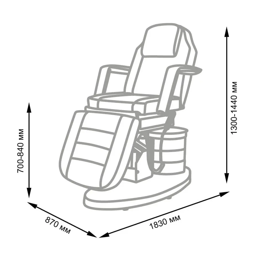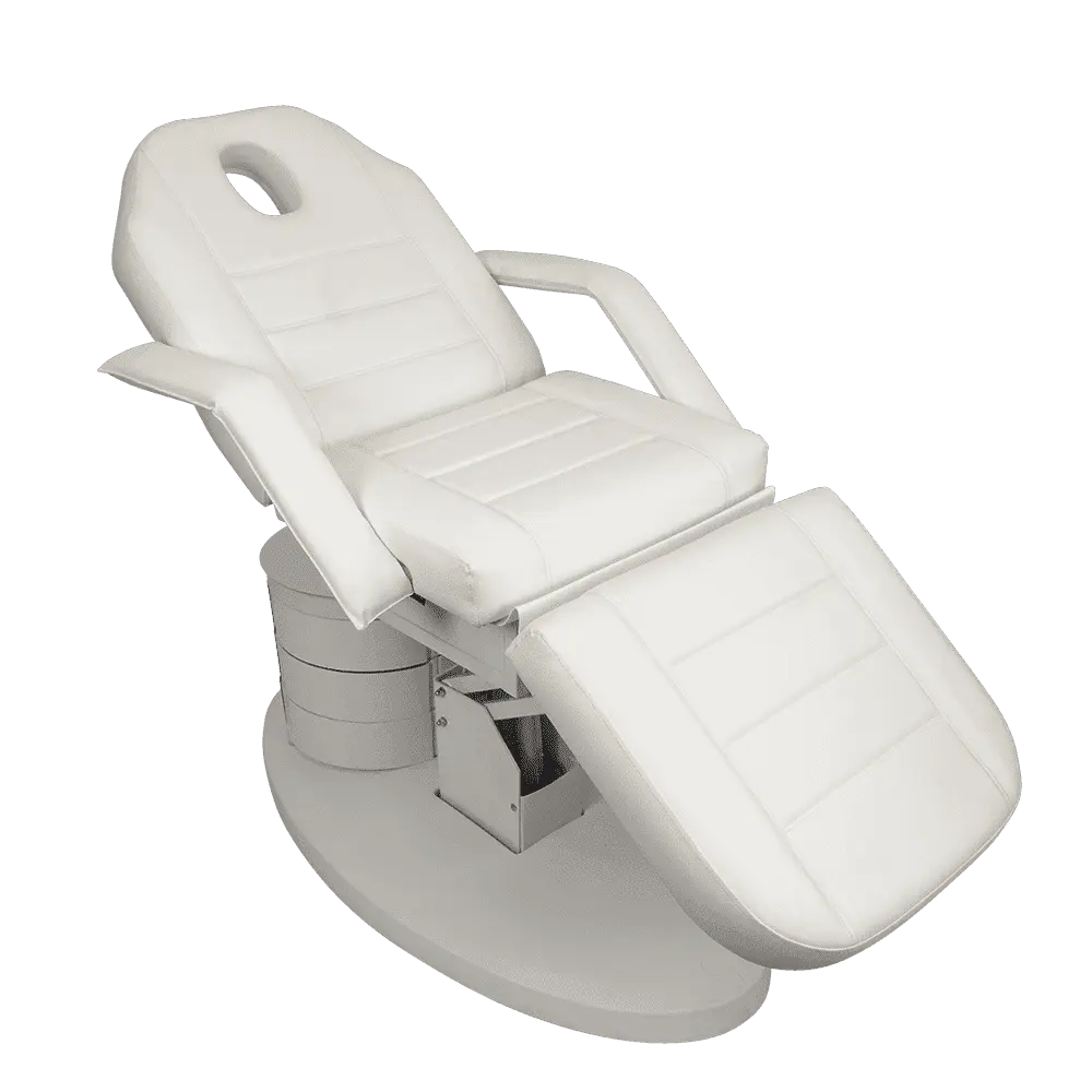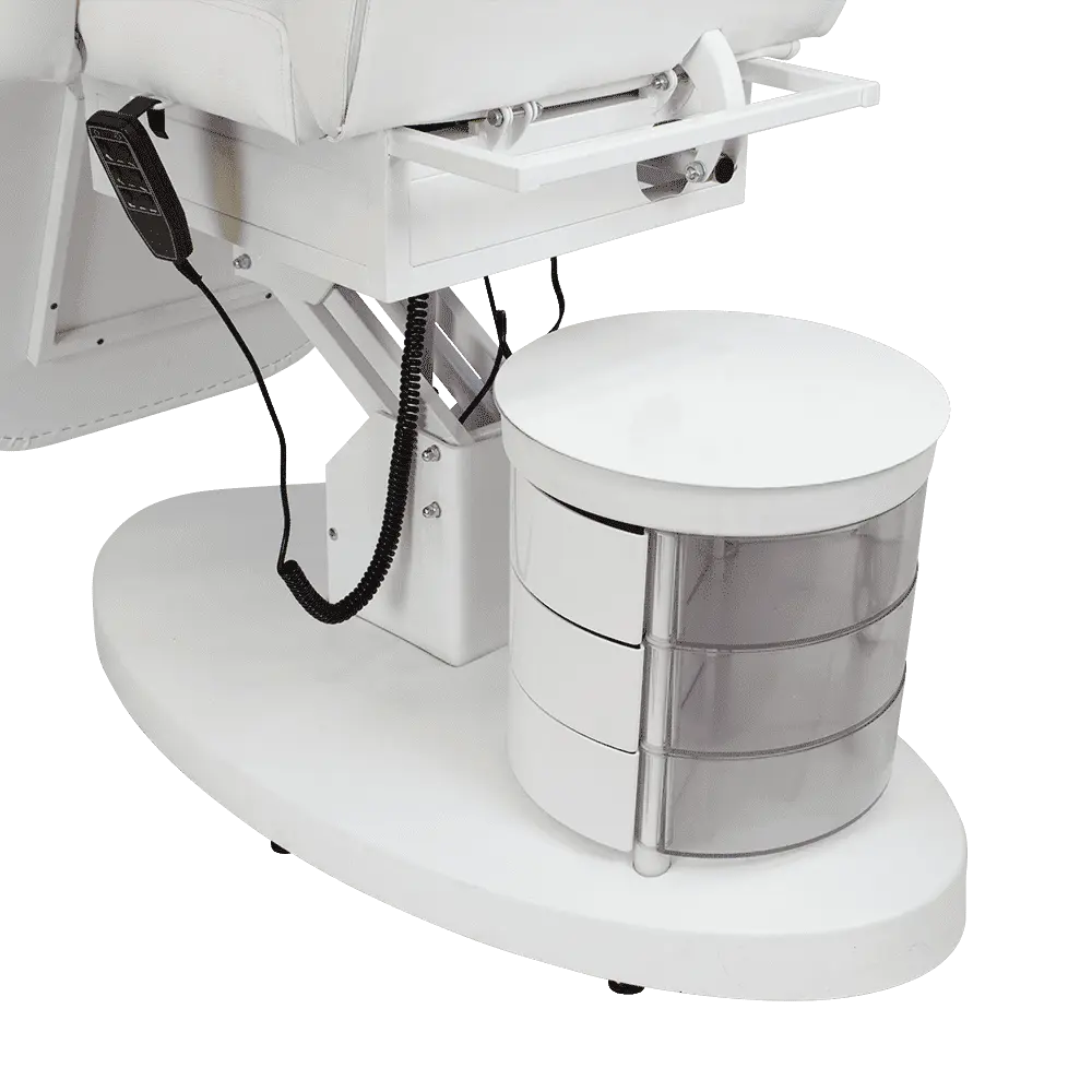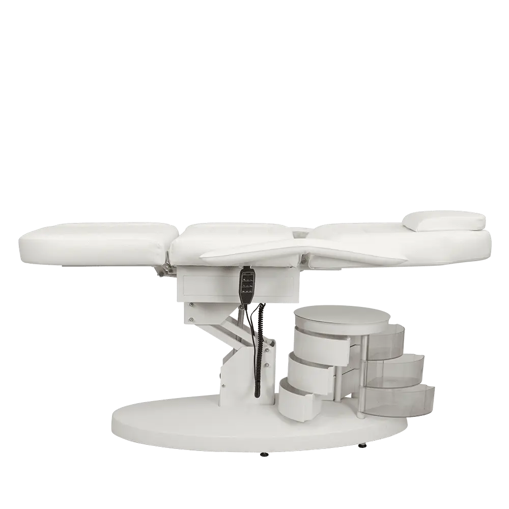 Большое и комфортное кресло имеет три мотора, отвечающих за одну подвижную часть. Данные регулировки позволяют подобрать оптимальное положение для клиента. Если есть необходимость трансформировать кресло в кушетку, можно снять подлокотники и подголовник. Под подушкой есть специальное отверстие для лица посетителей. В тумбочке мастер сможет хранить инструменты первой необходимости, что позволит быстро находить инструменты и косметику.