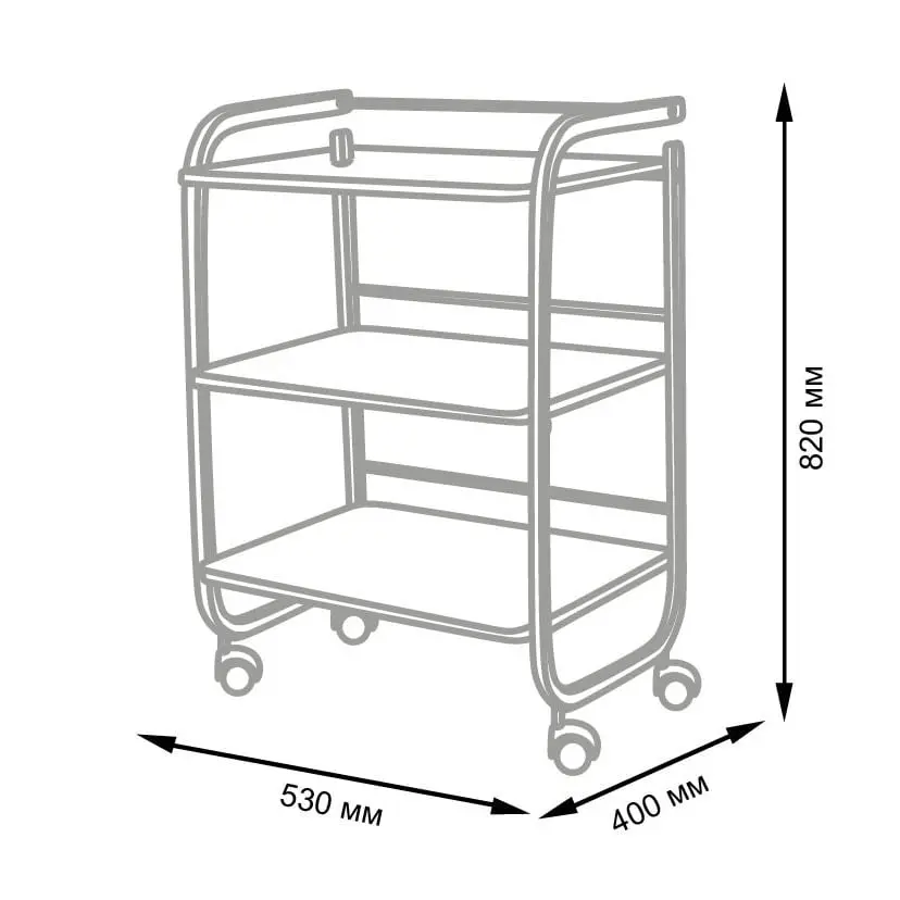 Комплектация: металлический каркас, три полки с бортиками, колеса.