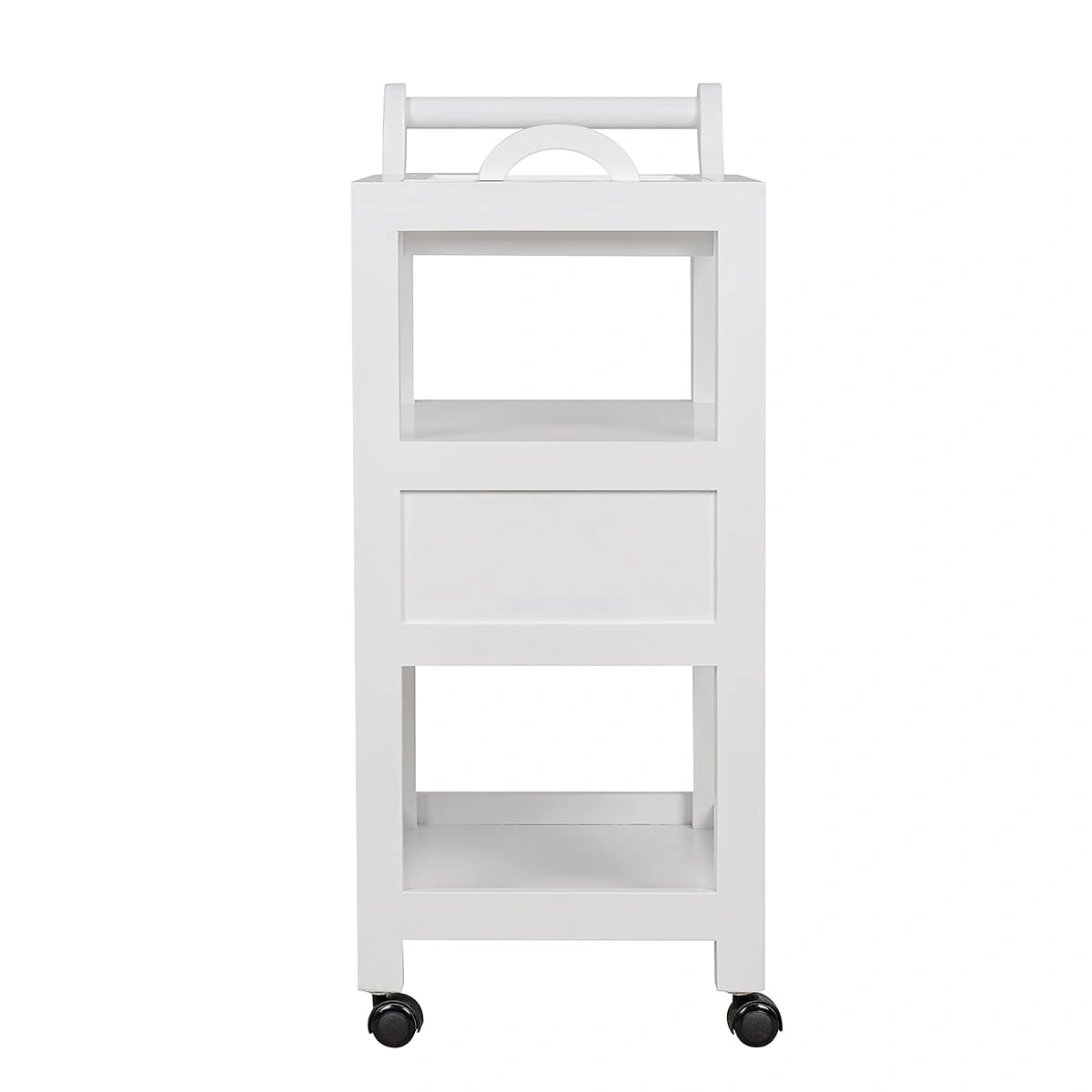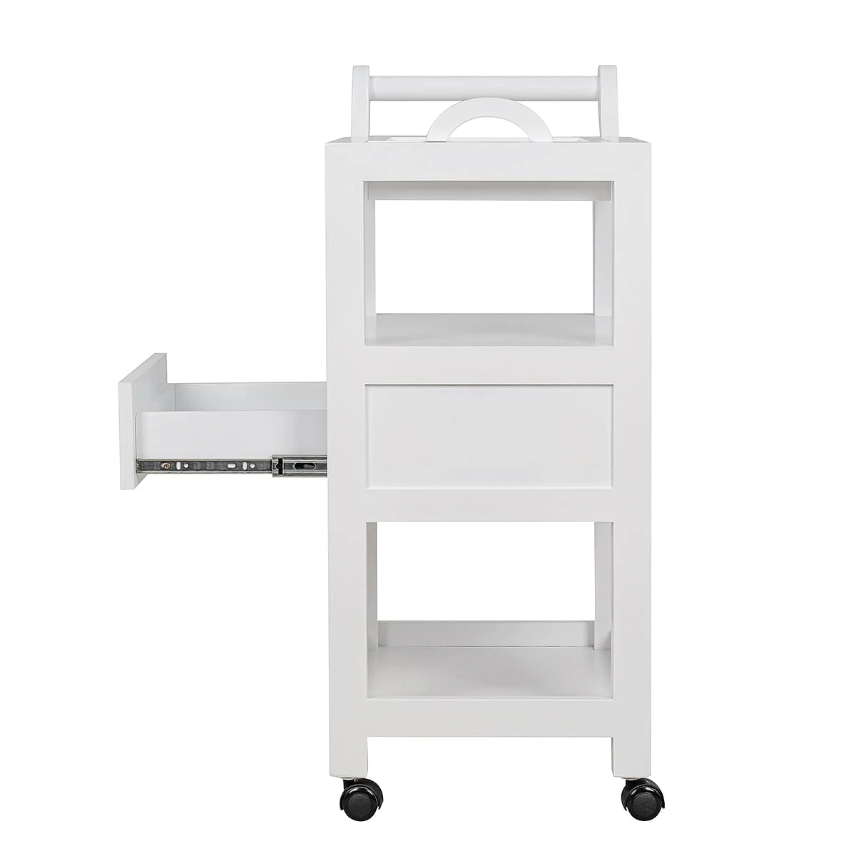 Комплектация: 1 выдвижной ящик и 3 открытые полки; нижняя и верхняя полки с бортиками; в центре верхней полки съемный столик; ручка для удобного перемещения; 4 опорных колеса; 2 цвета.