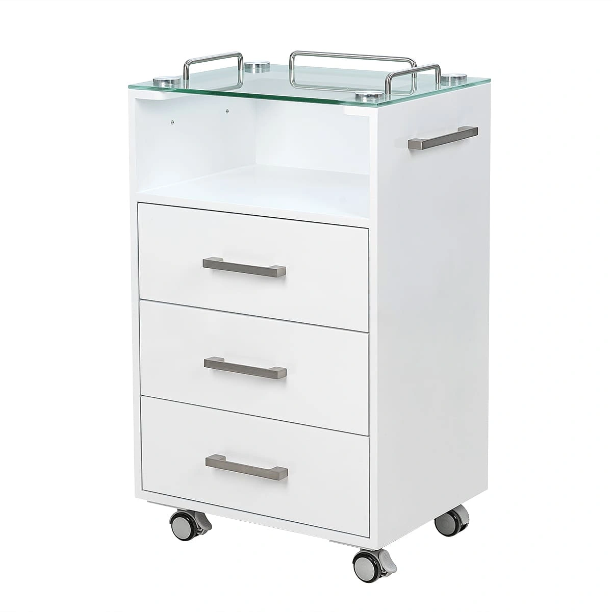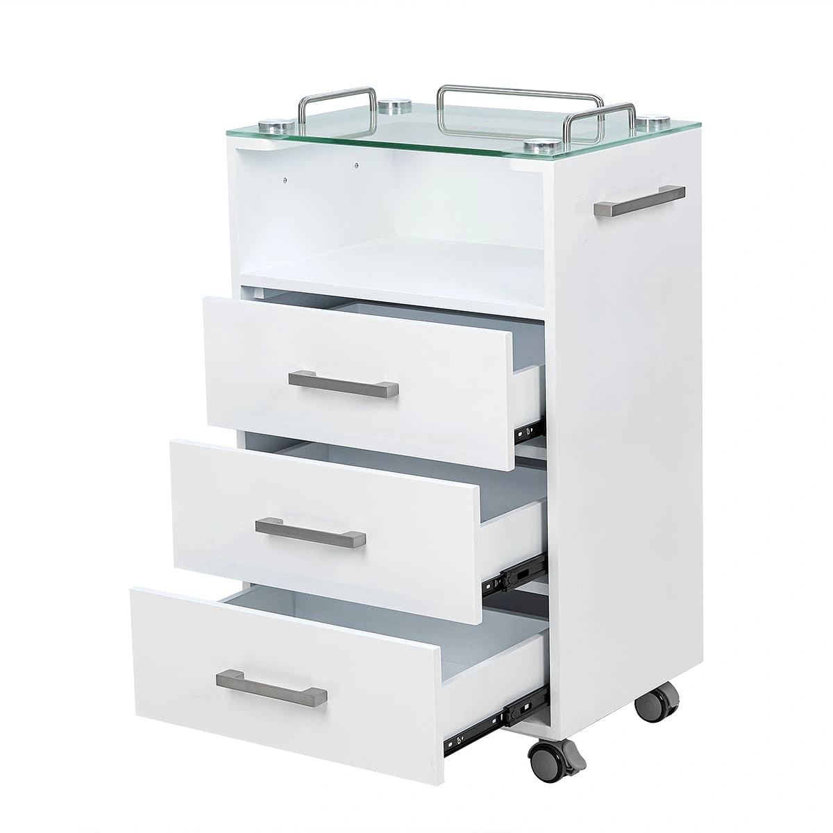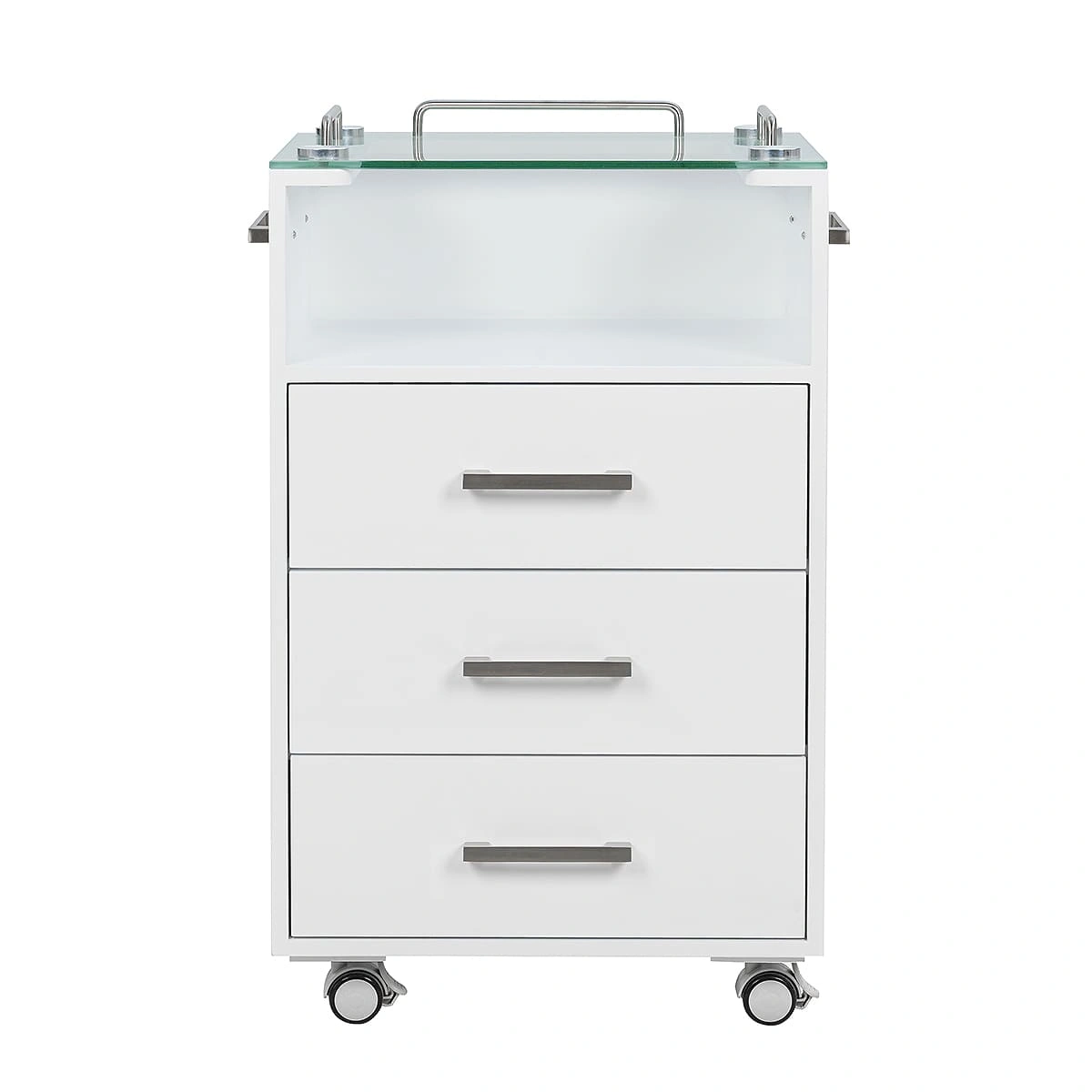 Конструкция столика отличается своей простотой и функциональностью. Вместительная тумба с тремя выдвижными ящиками, где можно хранить все необходимые расходные материалы. В открытой полке мастер может разложить принадлежности, которые часто использует при косметологических или СПА-процедурах. А на стеклянной полке сверху удобно размещать инструменты и средства, которые используются в данный момент. Хромированные бортики служат надежным барьером от случайного падения инструментов на пол. Ручки по бокам тумбы позволяют не только легко перемещать столик, но и разместить на них аксессуары.