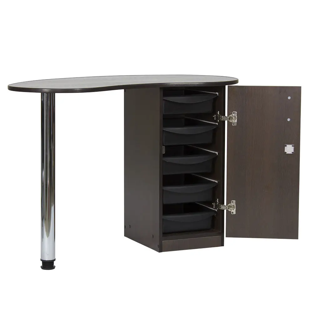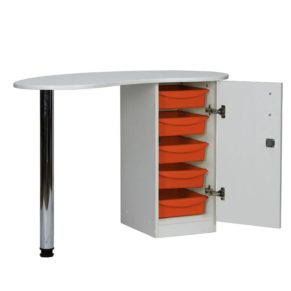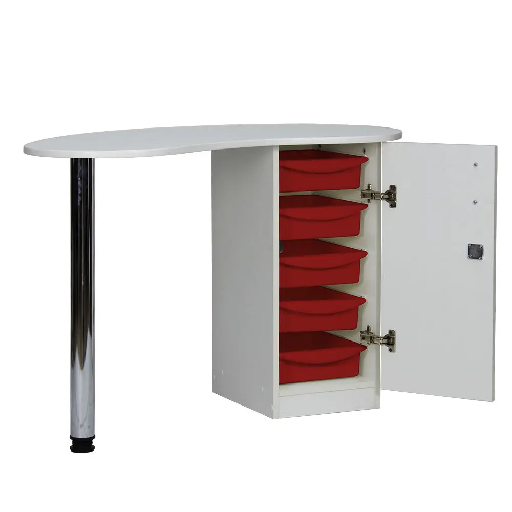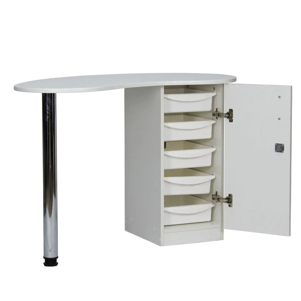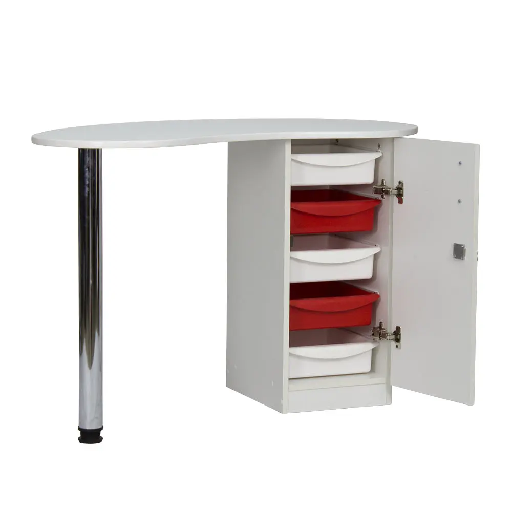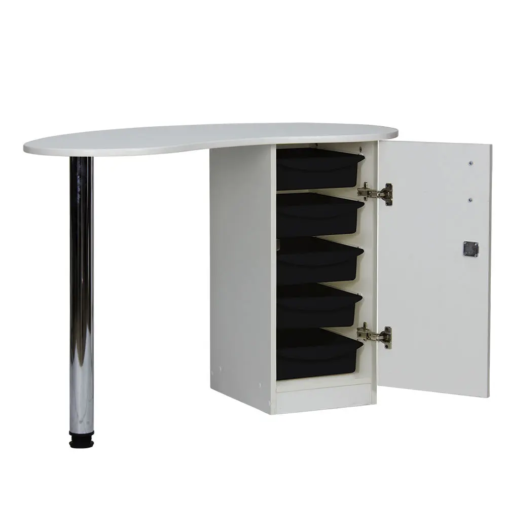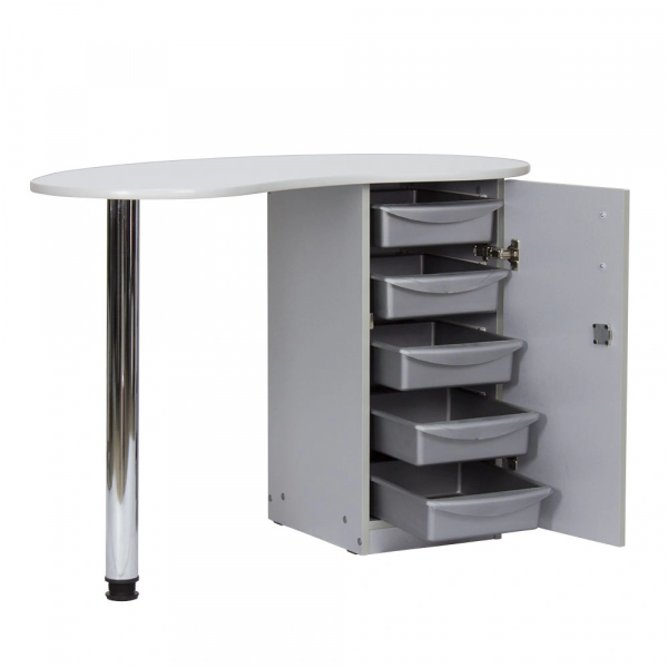 Столешница имеет форму капли. На широкой стороне столешницы мастер может поставить аппараты для маникюра, стойку с лаками, лампу и прочие аксессуары. Узкая сторона открывает легкий доступ к рукам клиента. С вместительными ящиками каждый предмет для маникюра будет лежать на своем месте. Переместить стол не потребует особых усилий, ведь под тумбой есть встроенные маневренные колеса.