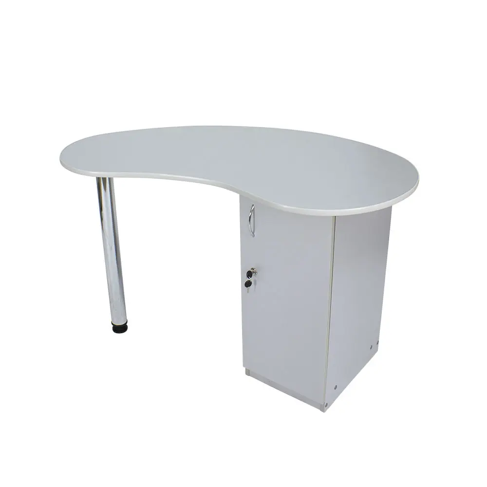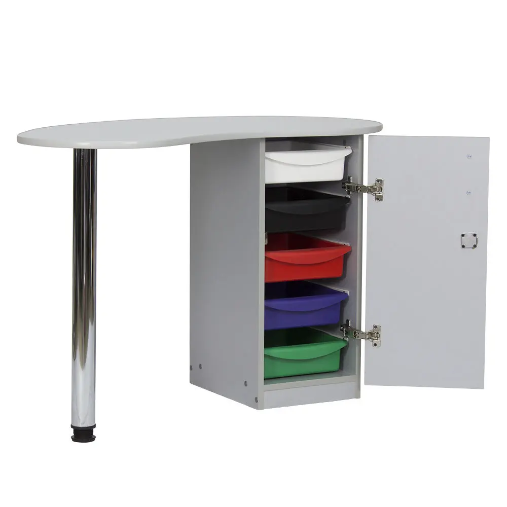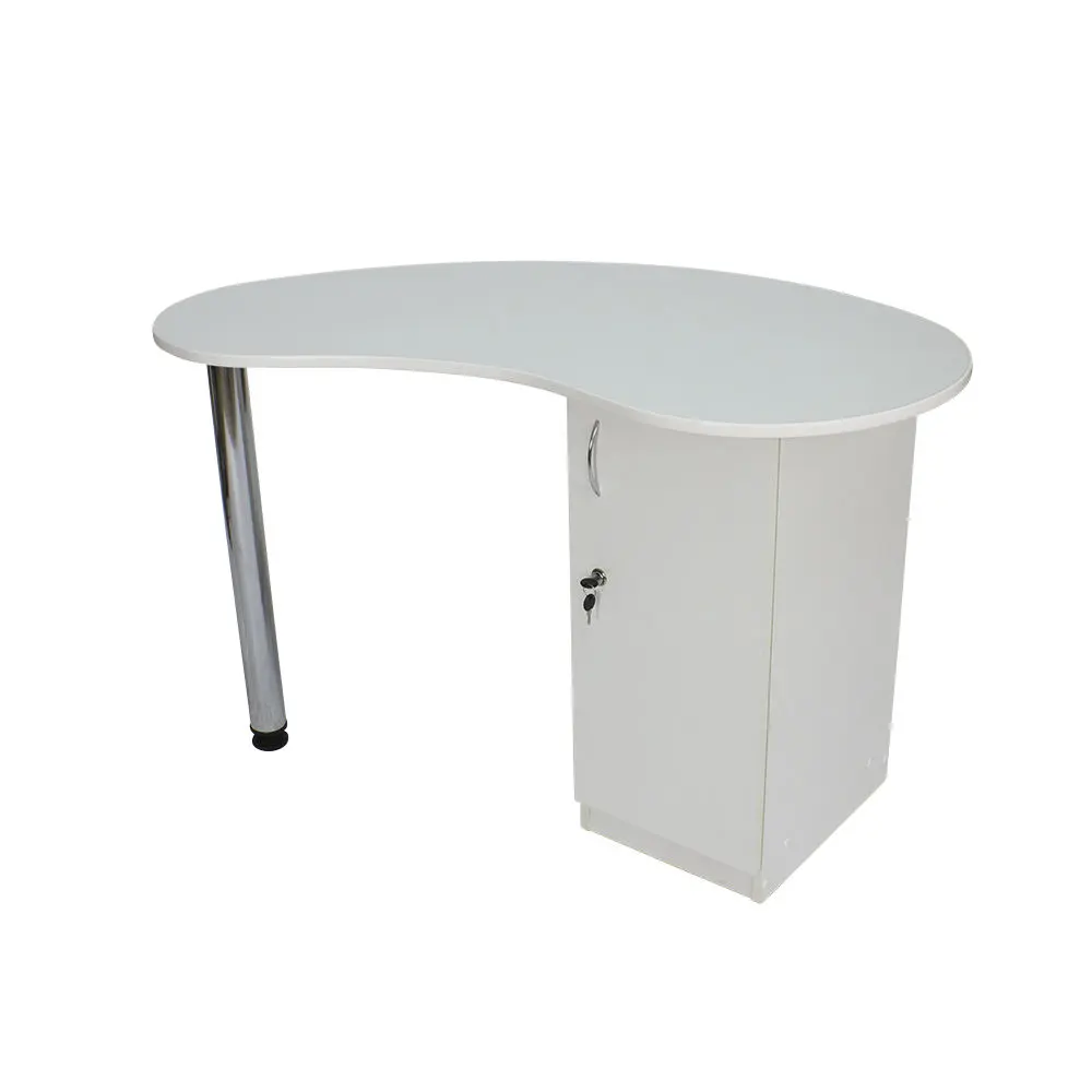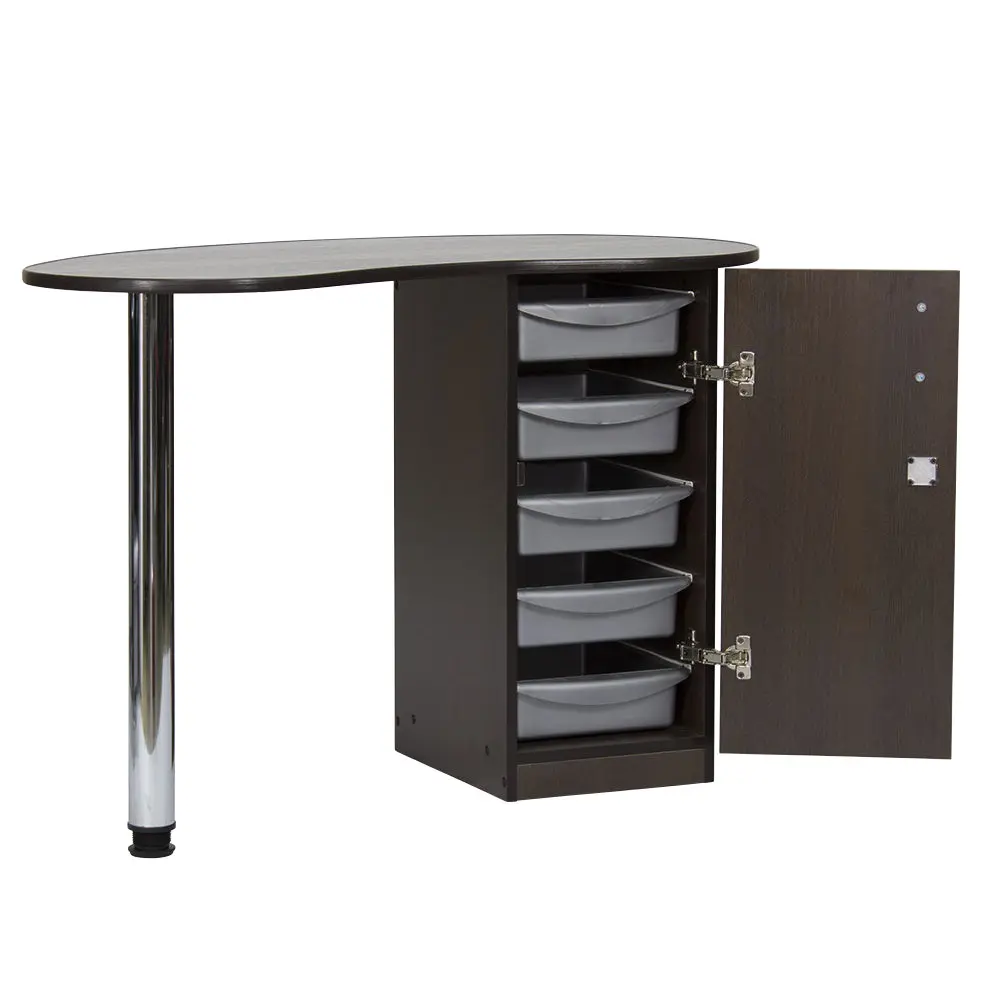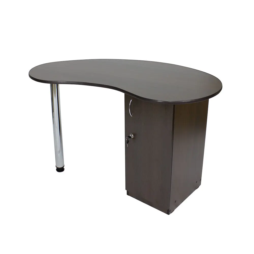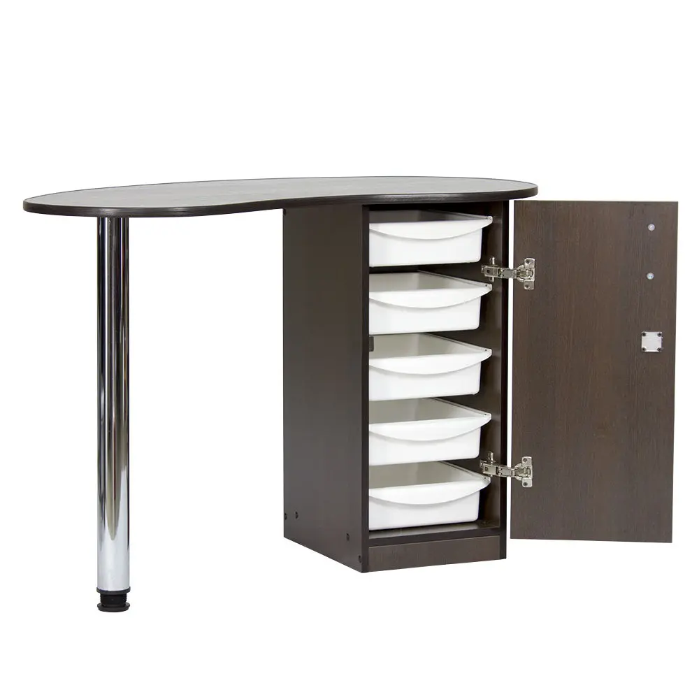 Столешница имеет форму капли. На широкой стороне столешницы мастер может поставить аппараты для маникюра, стойку с лаками, лампу и прочие аксессуары. Узкая сторона открывает легкий доступ к рукам клиента. С вместительными ящиками каждый предмет для маникюра будет лежать на своем месте. Переместить стол не потребует особых усилий, ведь под тумбой есть встроенные маневренные колеса.