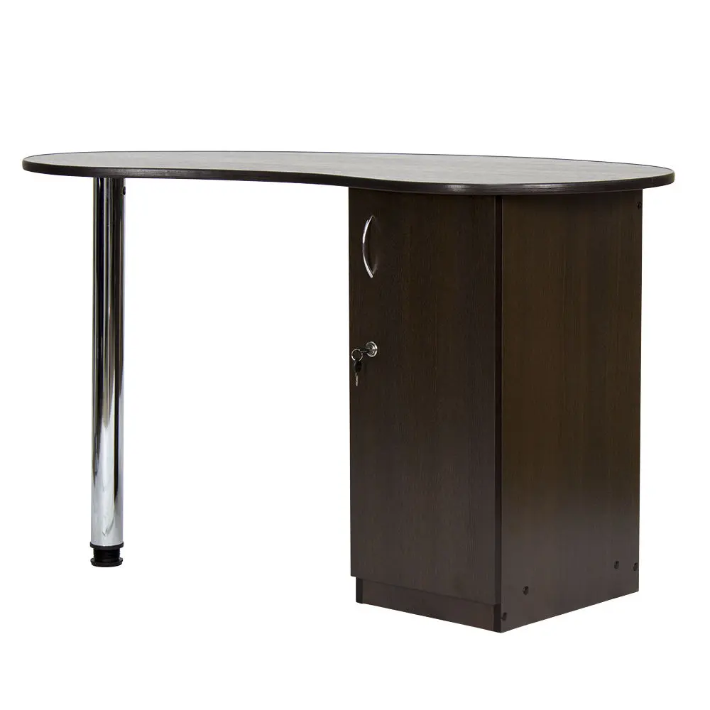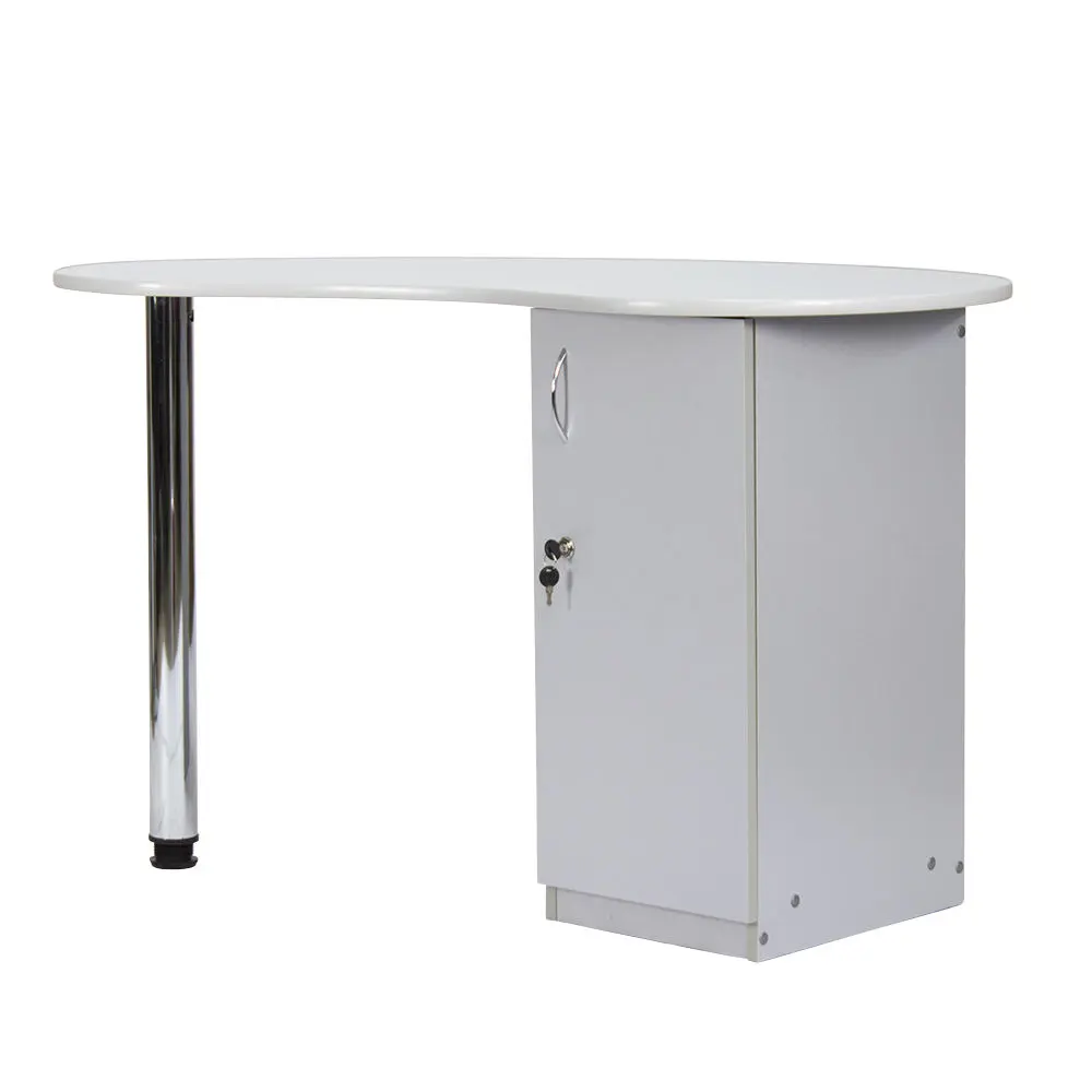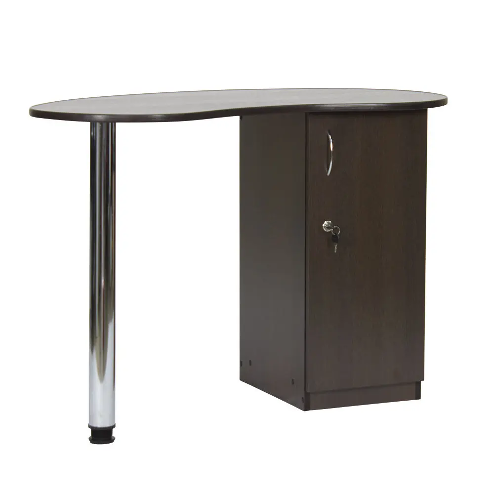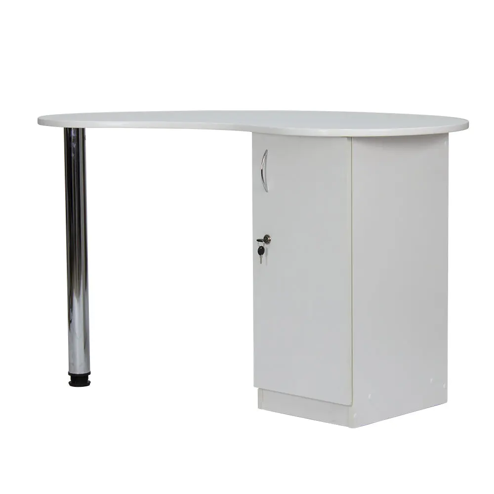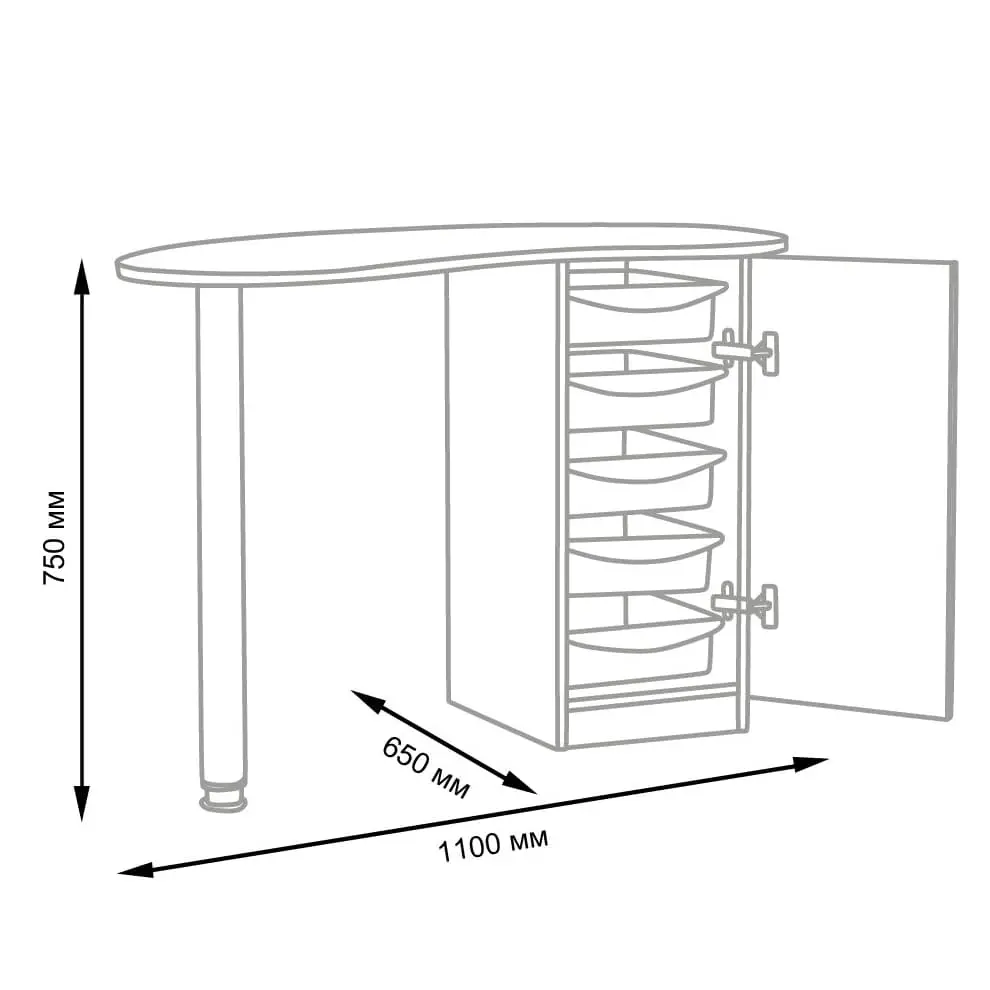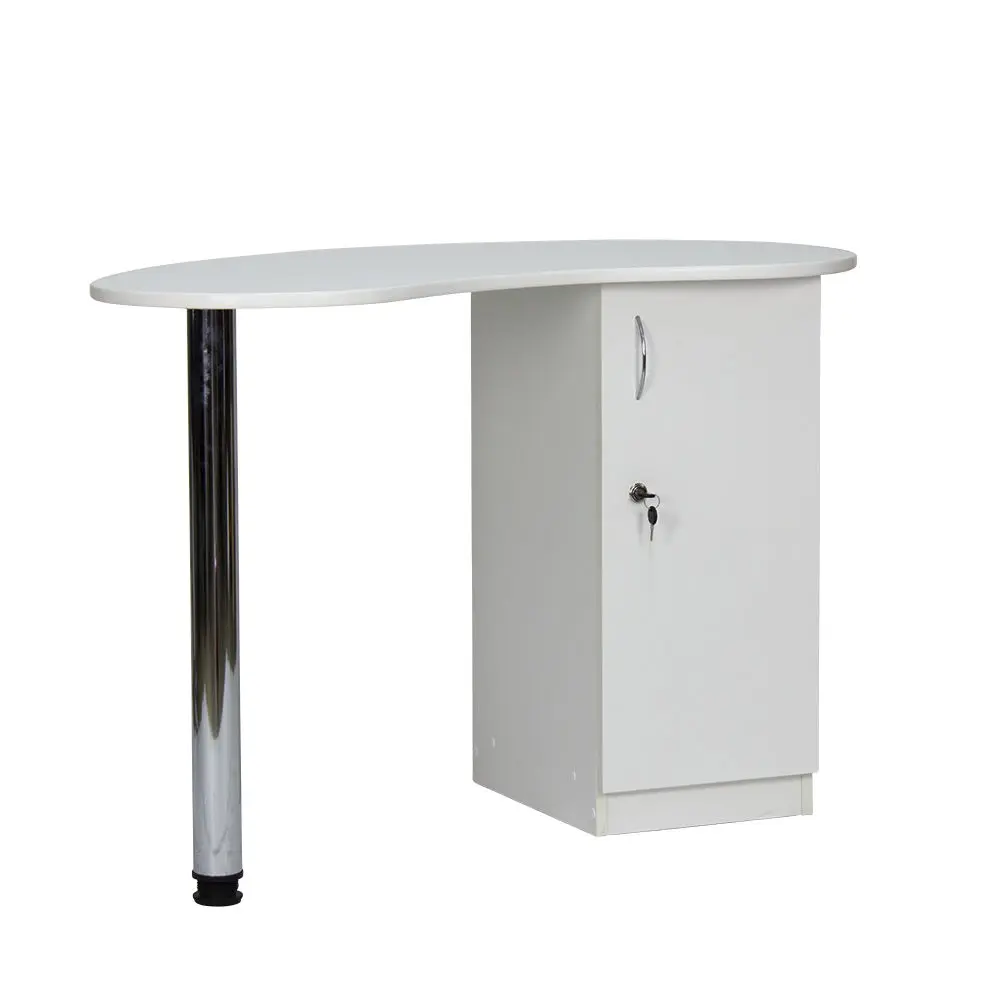 Столешница имеет форму капли. На широкой стороне столешницы мастер может поставить аппараты для маникюра, стойку с лаками, лампу и прочие аксессуары. Узкая сторона открывает легкий доступ к рукам клиента. С вместительными ящиками каждый предмет для маникюра будет лежать на своем месте. Переместить стол не потребует особых усилий, ведь под тумбой есть встроенные маневренные колеса.