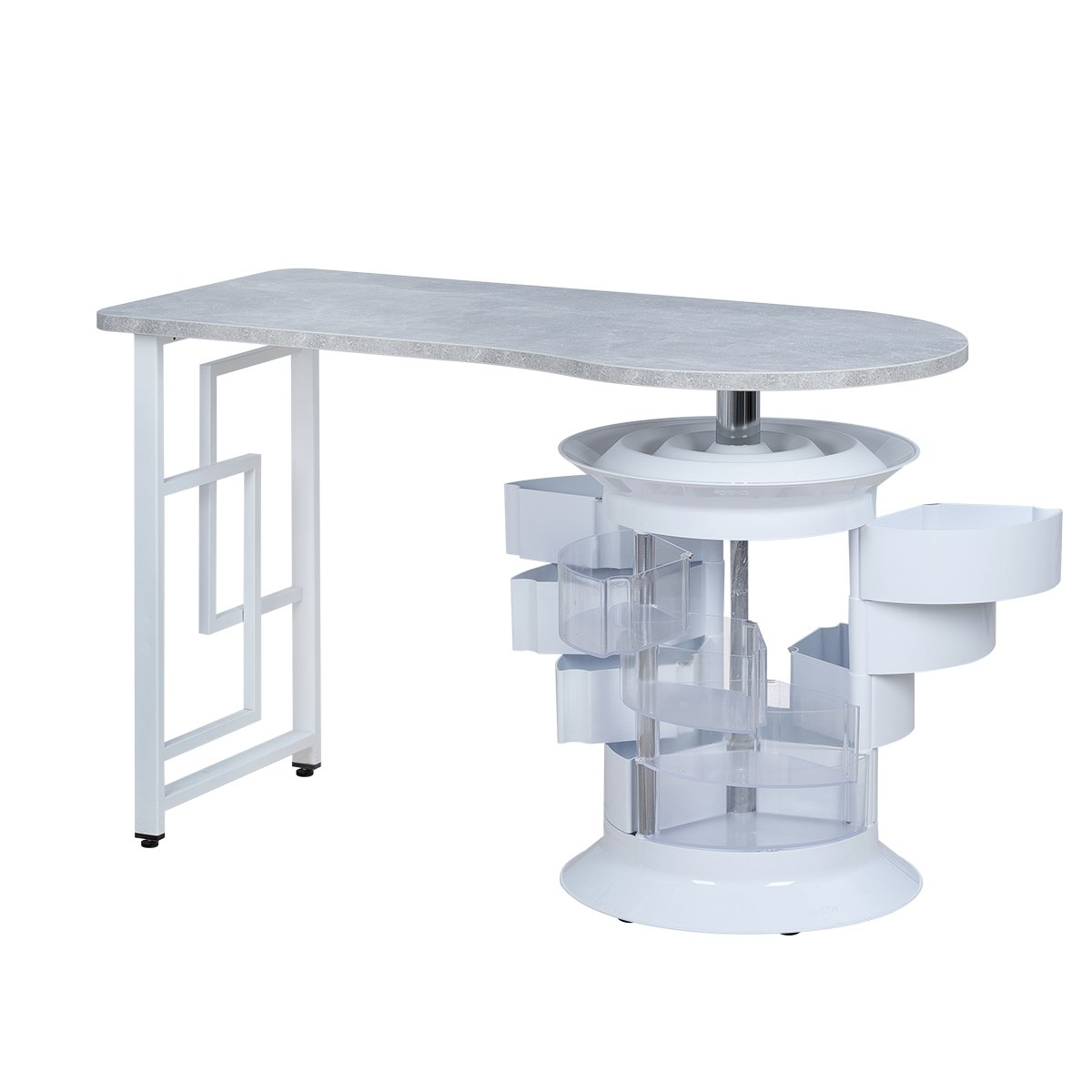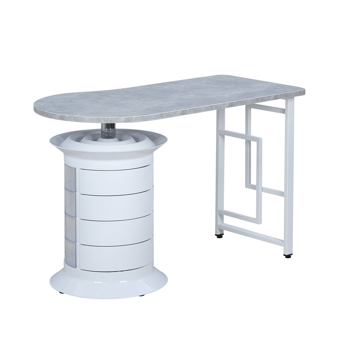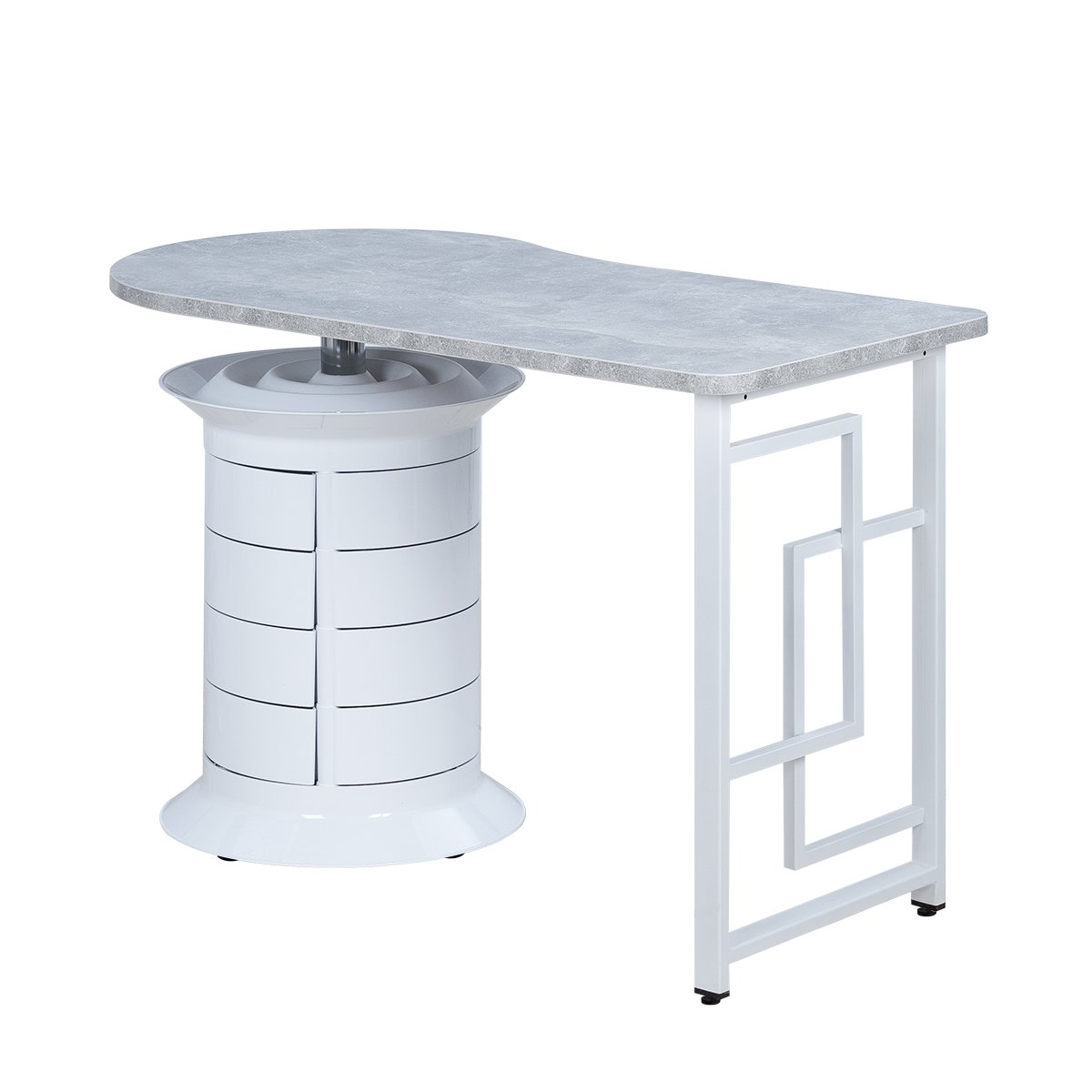 Лаконичный маникюрный стол, созданный для профессионалов, которые ценят порядок и удобство. Столешница с фактурой камня устойчива к нагрузкам и легко очищается, а металлическая опора с геометрическим узором придаёт конструкции лёгкость и прочность.