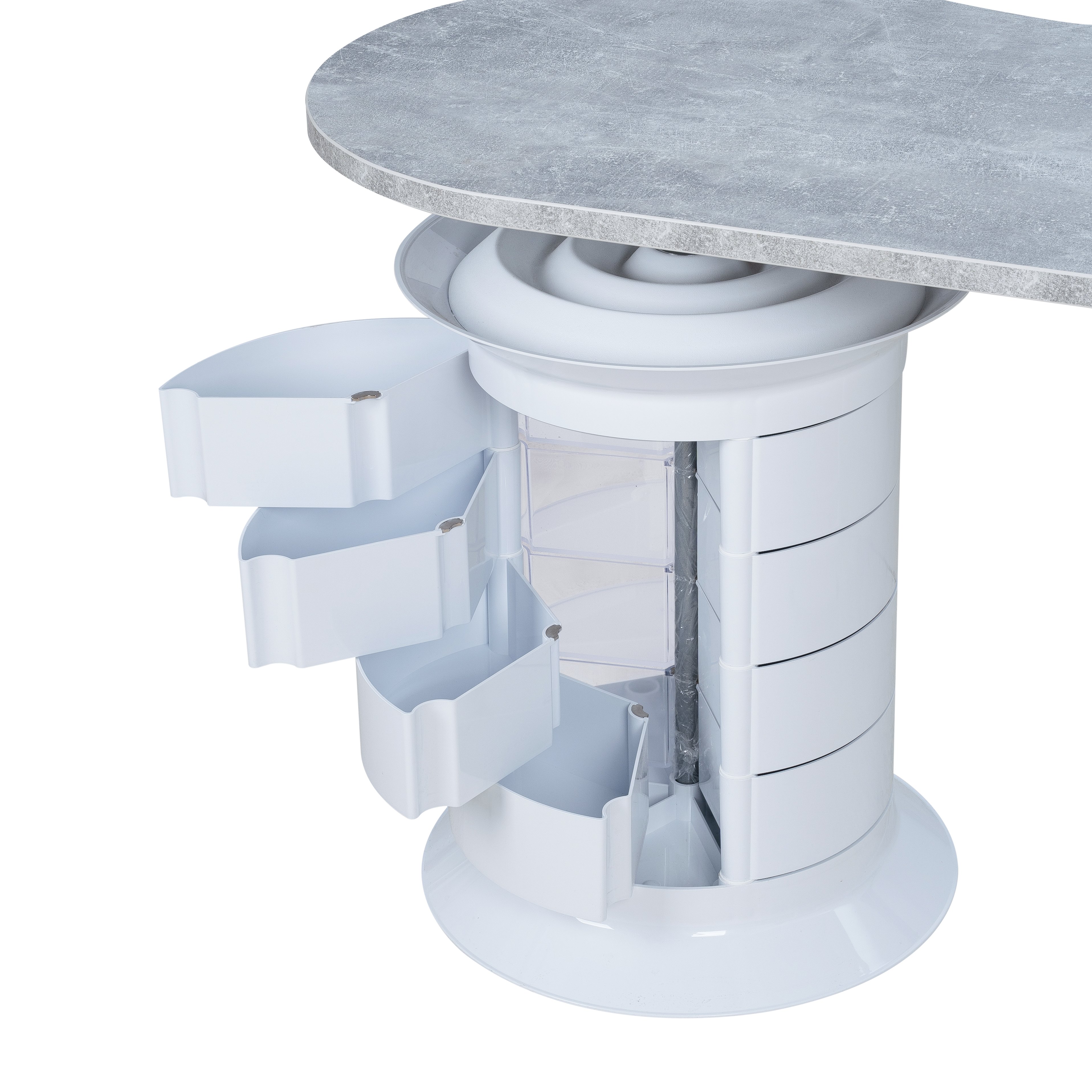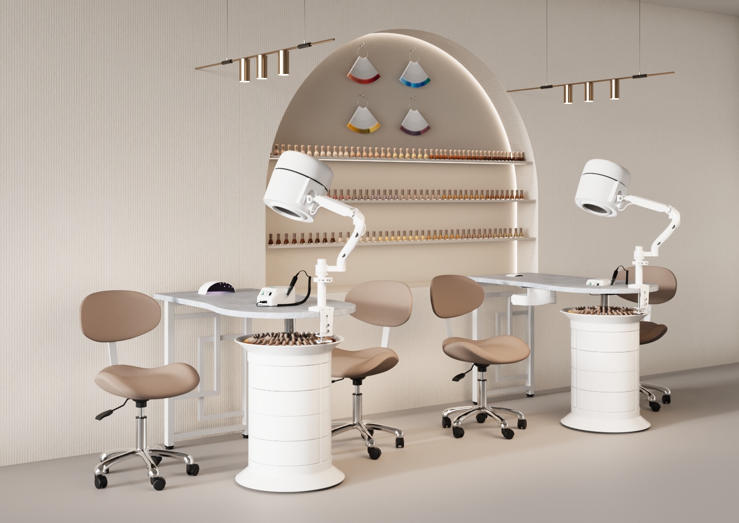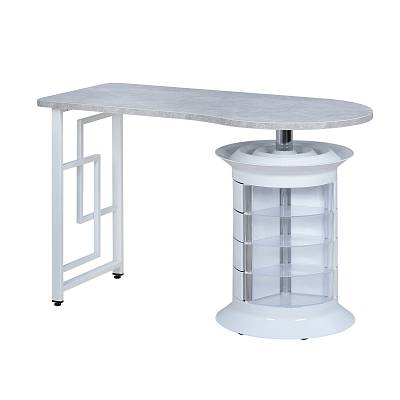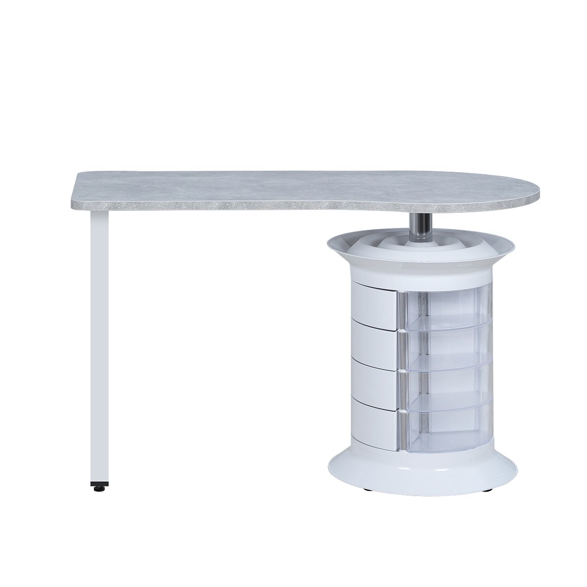 Лаконичный маникюрный стол, созданный для профессионалов, которые ценят порядок и удобство. Столешница с фактурой камня устойчива к нагрузкам и легко очищается, а металлическая опора с геометрическим узором придаёт конструкции лёгкость и прочность.
