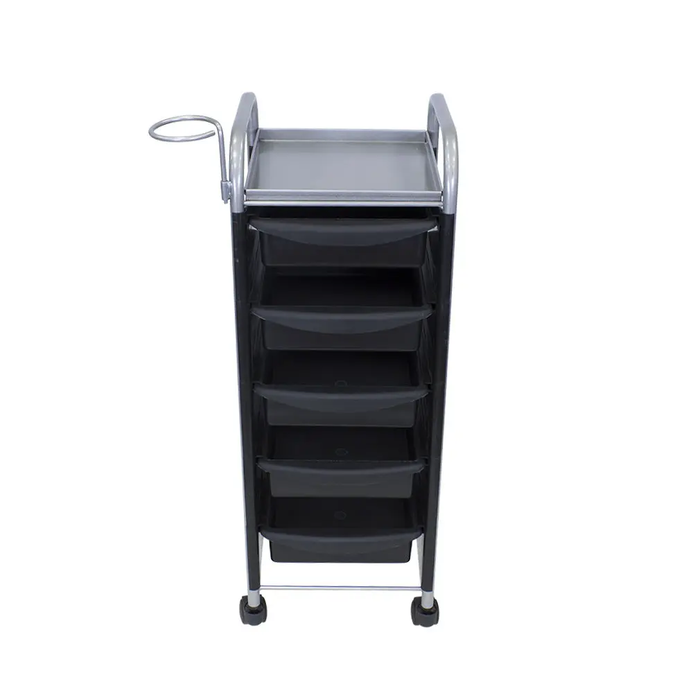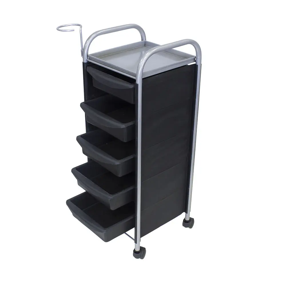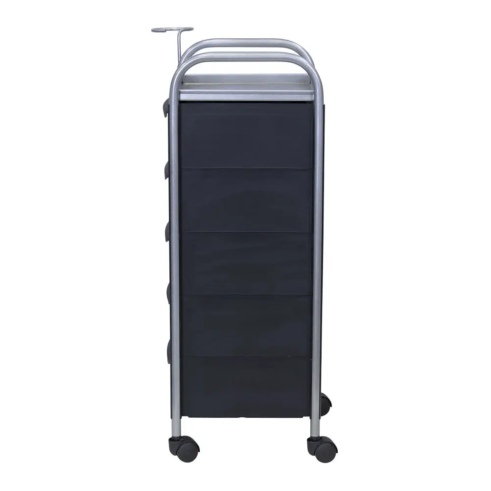 Комплектация: основа из металла на манёвренных колесиках, боковые пластиковые панели, выдвижные ящики (5 штук), верхняя полка.