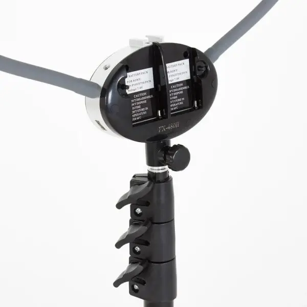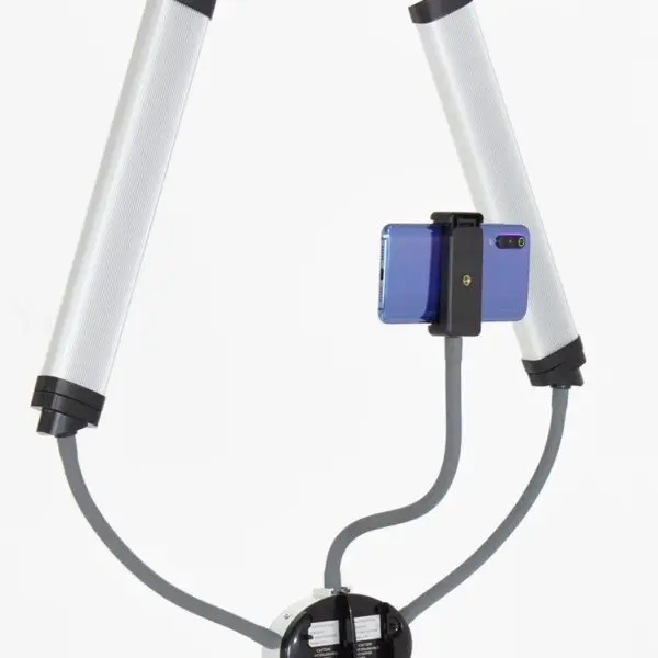 Конструкция лампы - два симметрично расположенных светильника на гнущейся основе. Компактная лампа позволяет настраивать оптимальный уровень света и фиксировать любой угол наклона. С помощью гибкого кронштейна можно снимать интересные видео процесса работы. Благодаря удобному штативу можно регулировать высоту лампы. Тренога легко собирается и разбирается. В комплекте есть практичная сумка, с помощью которой можно транспортировать и хранить оборудование.
