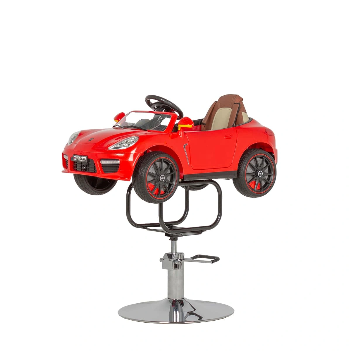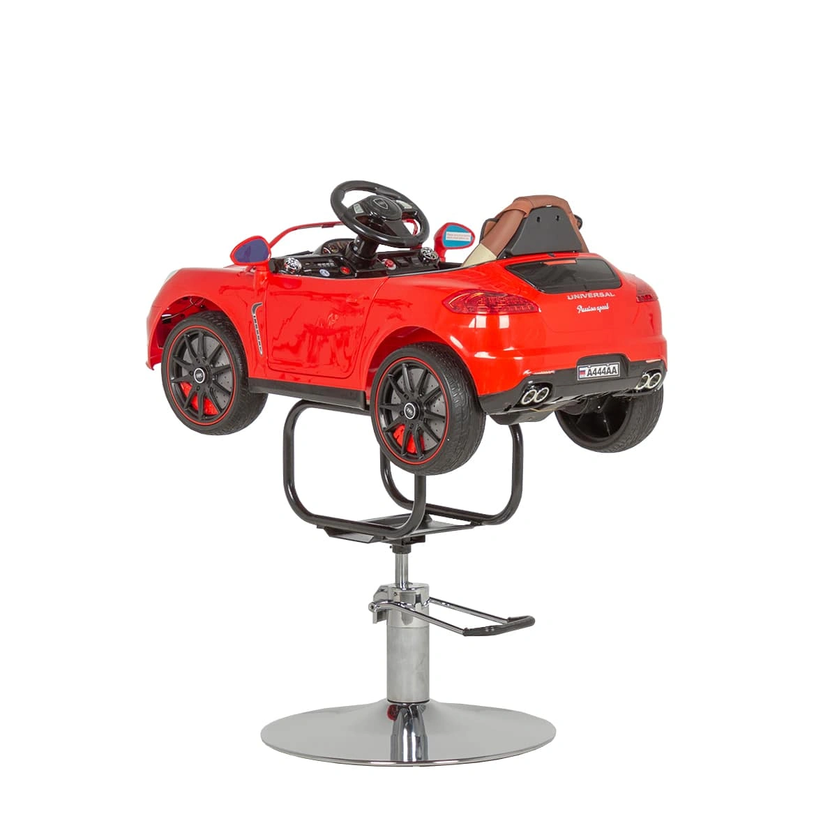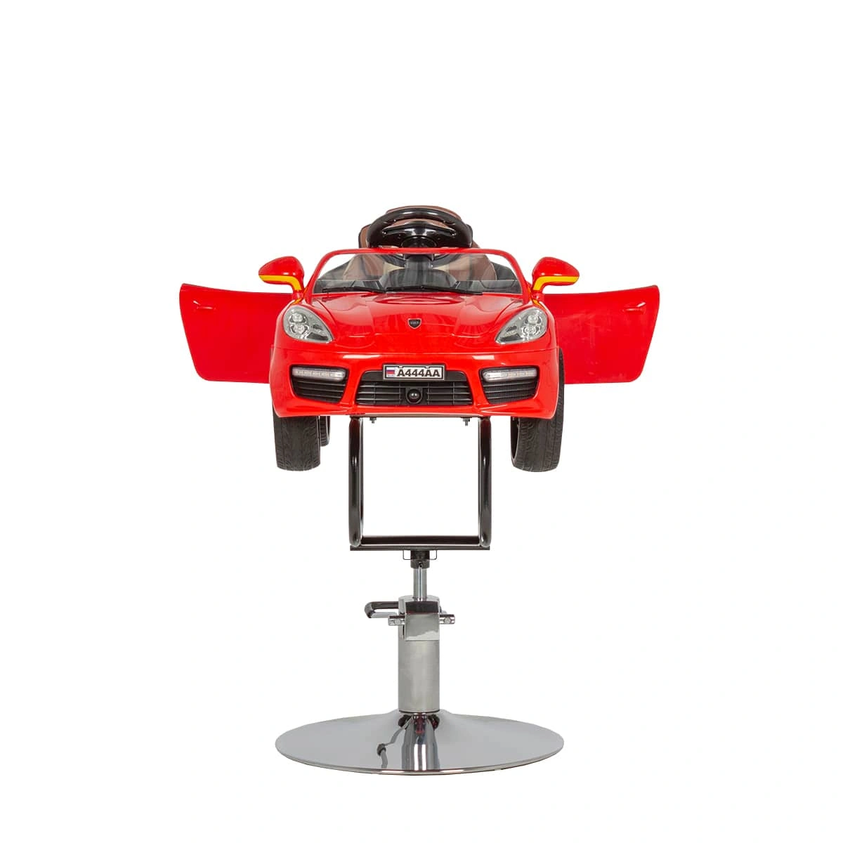 Детское парикмахерское кресло Машинка 02 стилизовано под спортивный кабриолет. Кресло имеет яркий, привлекающий внимание дизайн, благодаря чему прекрасно впишется в детскую зону салона красоты. Внутри автомобиля расположена приборная панель, руль, ключ зажигания. При повороте ключа машинка «заводится», зажигаются фары и фонари, подсвечивается панель приборов. Возможности детского парикмахерского кресла дополняет звуковой сигнал, магнитола и колонки для прослушивания музыки. В нашем магазине можно купить детское парикмахерское кресло Машинку красного цвета с такими размерами:
