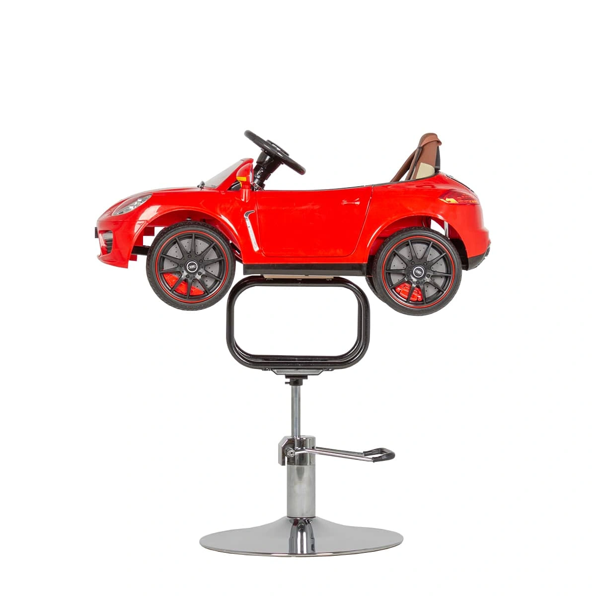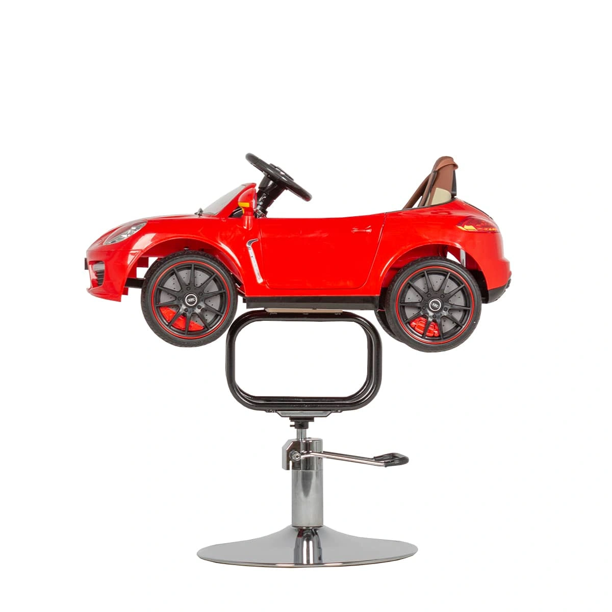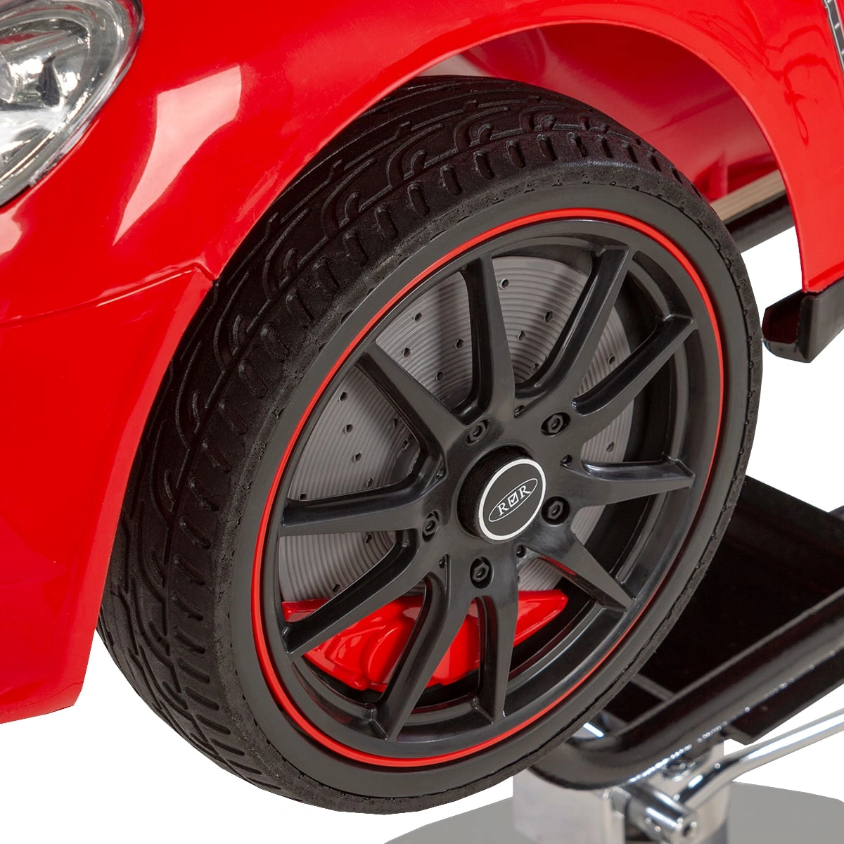 Детское парикмахерское кресло Машинка 02 стилизовано под спортивный кабриолет. Кресло имеет яркий, привлекающий внимание дизайн, благодаря чему прекрасно впишется в детскую зону салона красоты. Внутри автомобиля расположена приборная панель, руль, ключ зажигания. При повороте ключа машинка «заводится», зажигаются фары и фонари, подсвечивается панель приборов. Возможности детского парикмахерского кресла дополняет звуковой сигнал, магнитола и колонки для прослушивания музыки. В нашем магазине можно купить детское парикмахерское кресло Машинку красного цвета с такими размерами: