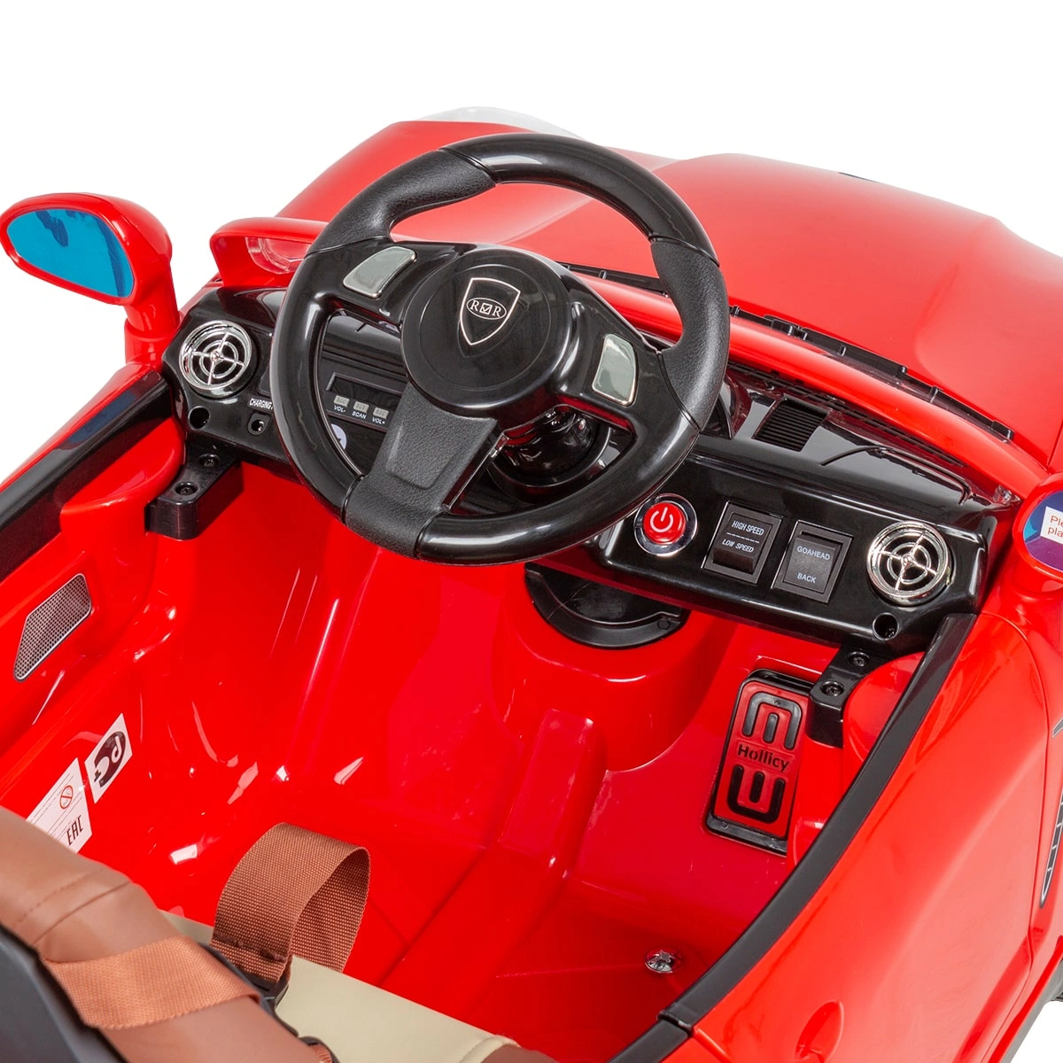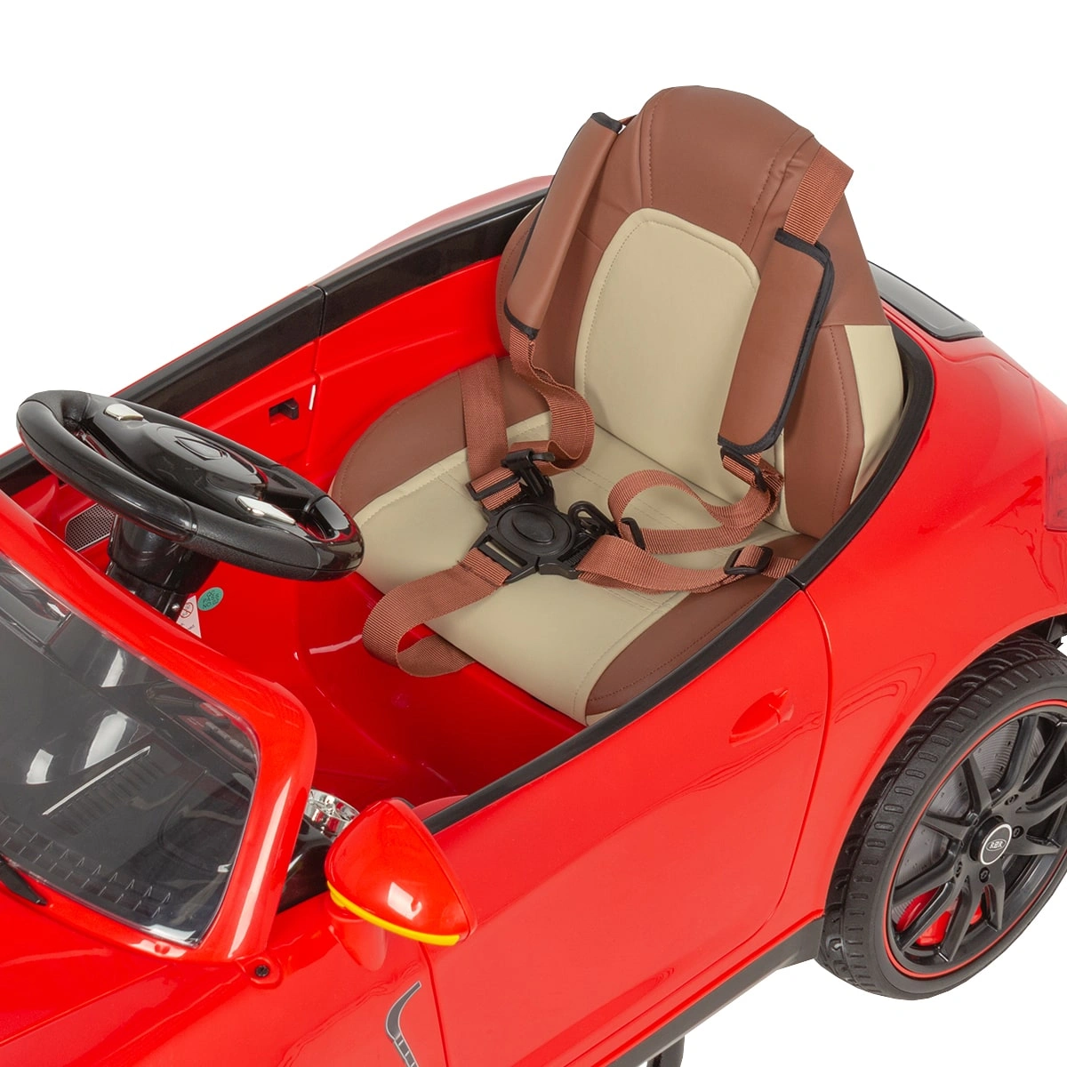 Машинка: оснащена удобным сиденьем с удерживающим ремнем, рулем, приборной панелью, фарами и задними фонарями, магнитолой и колонками, колесами.