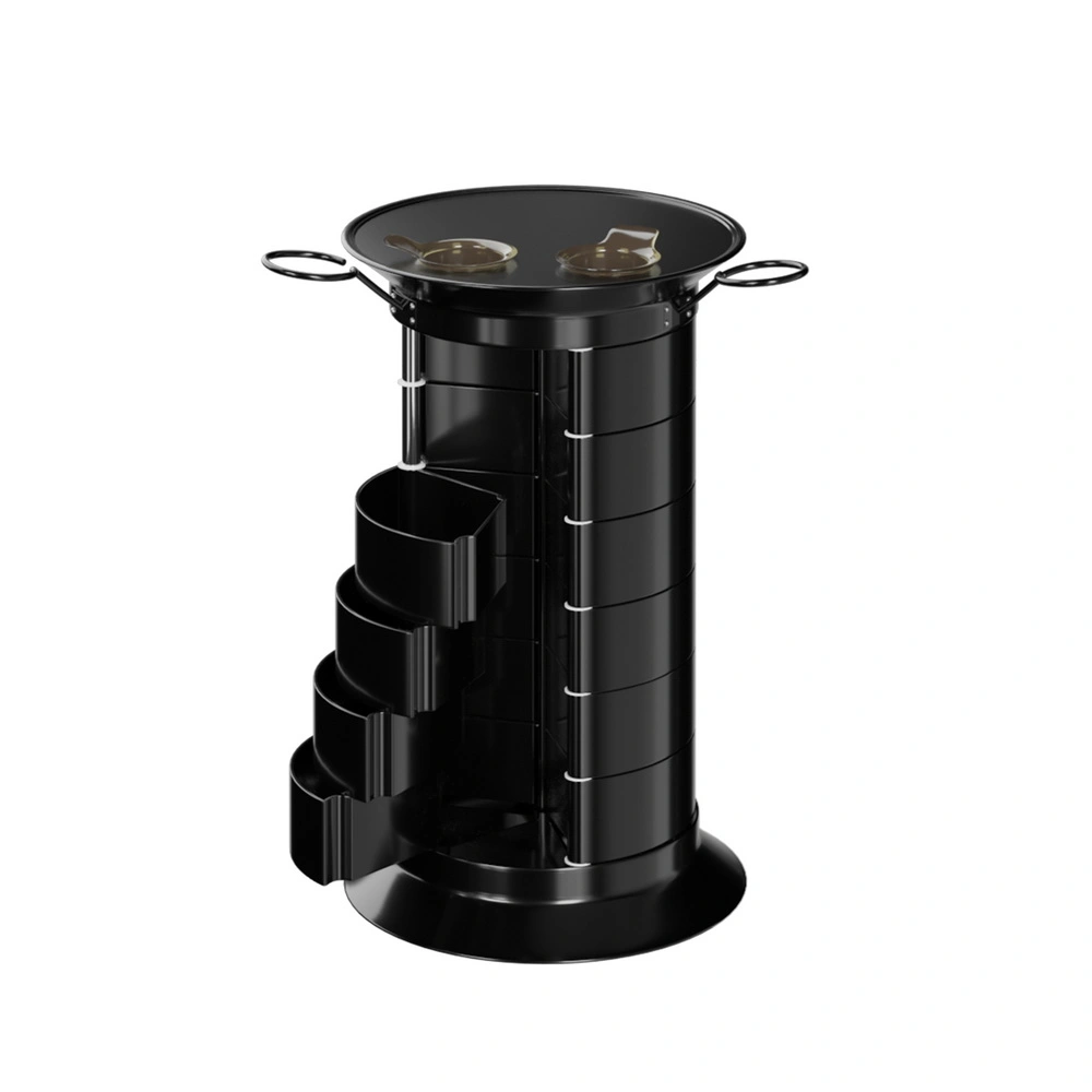 Продуманная конструкция позволит мастеру хранить все свои приспособления в одном месте. В распоряжении специалиста 16 раздвижных ящичков, которые поворачиваются вокруг стоек каркаса. Чтобы в тумбе можно было поставить высокие сосуды, с одной стороны отсутствует два ящика. Верхняя полка имеет специальные отверстия, предназначенные для емкостей и чаш. С двух сторон крышка оборудована держателями для фенов. Мобильность мебели обеспечивается шестью поворотными колесиками. Тележка может быть использована для обстановки двух рабочих мест.