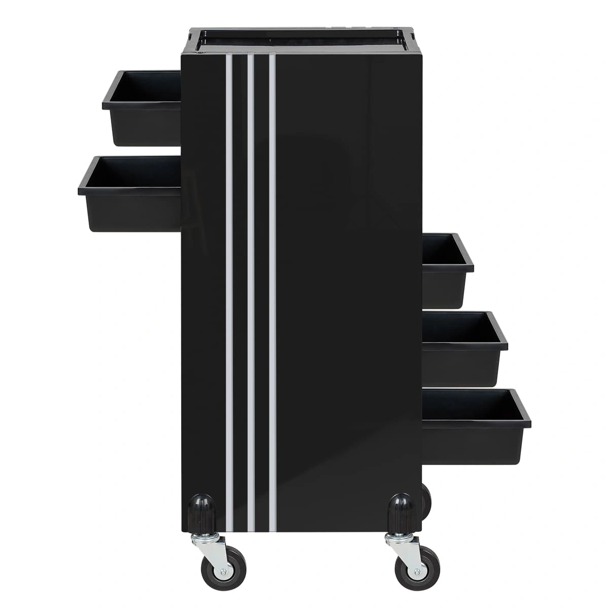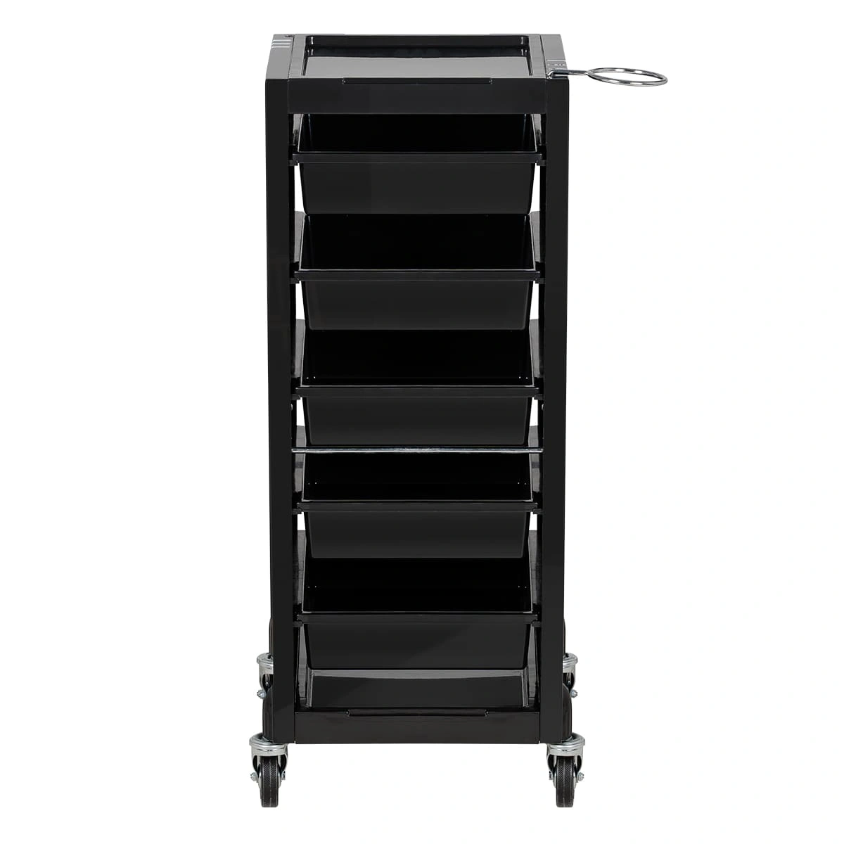 У парикмахерской тележки стильный прямоугольный дизайн с острыми углами. Верхняя крышка с фенодержателем и углублением для инструментов и баночек красоты, 5 вместительных выдвижных ящиков, это позволит мастеру организовать рабочее пространство и повысить эффективность работы.