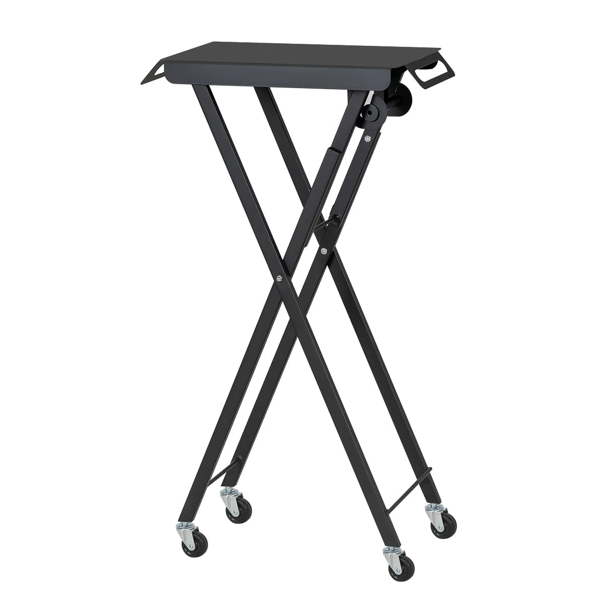 Верхняя часть тележки – плоская металлическая крышка с 3 магнитными чашами в комплекте. Сбоку вращающийся ролик для фольги, а боковые стороны столешницы имеют зубцы для её аккуратной и быстрой резки. Основание на 4 манёвренных колесах.