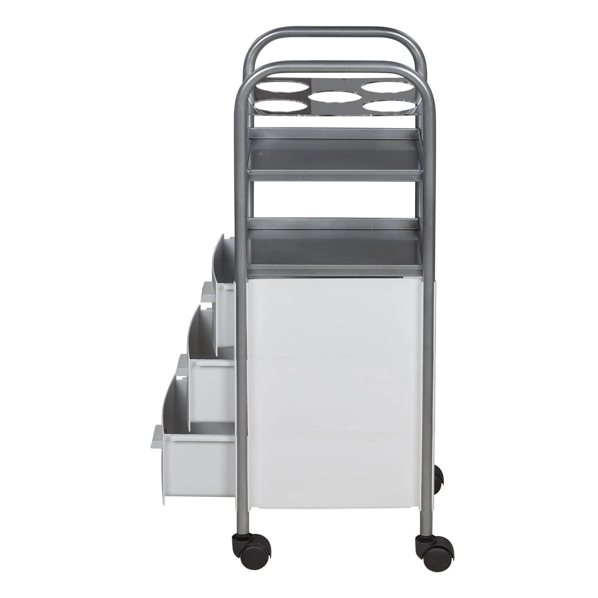 Для инструментов и расходных материалов в тележке предусмотрены три выдвижных ящика. Верхняя полка оснащена специальной панелью с отверстиями для высоких флаконов. Над ящиками есть еще одна практичная полка. Для быстрого и удобного перемещения по кабинету в конструкции предусмотрены маневренные колесики.