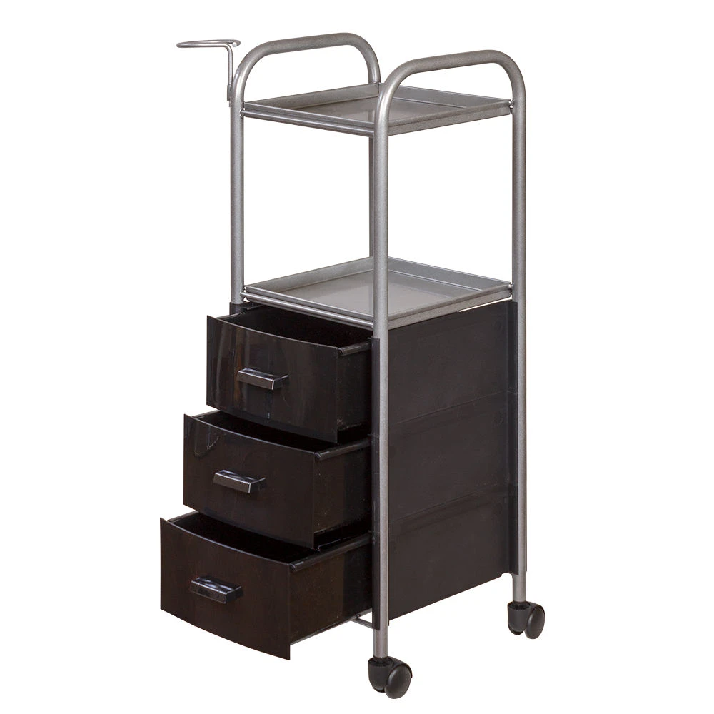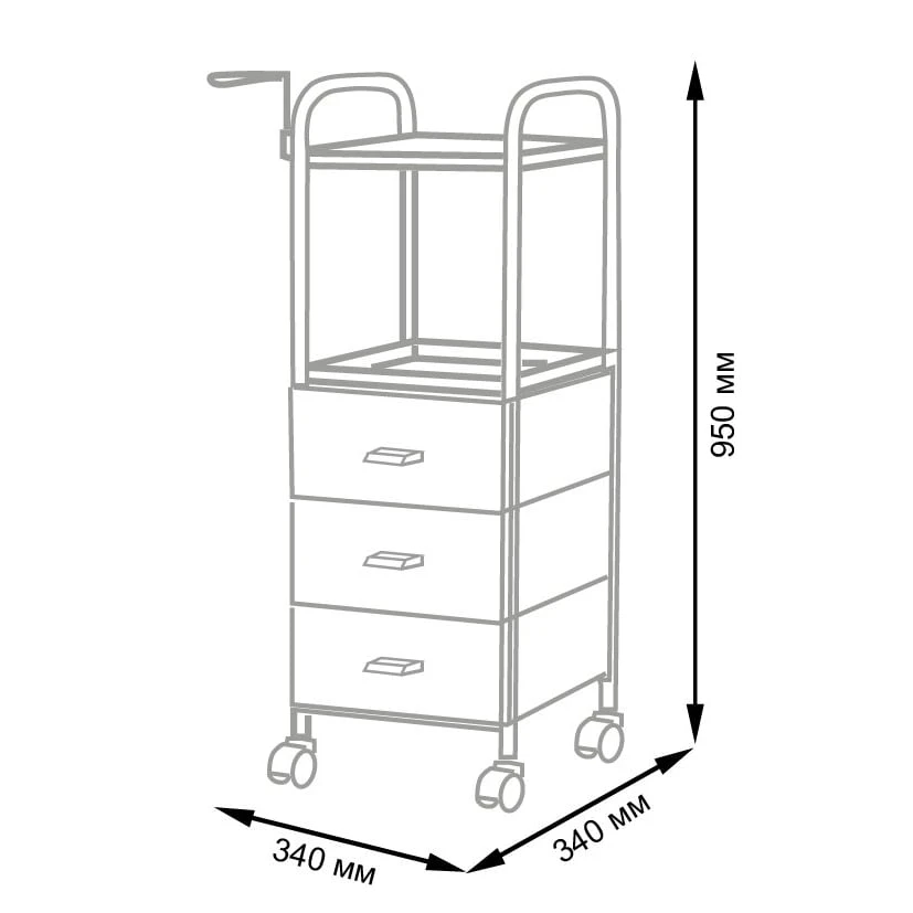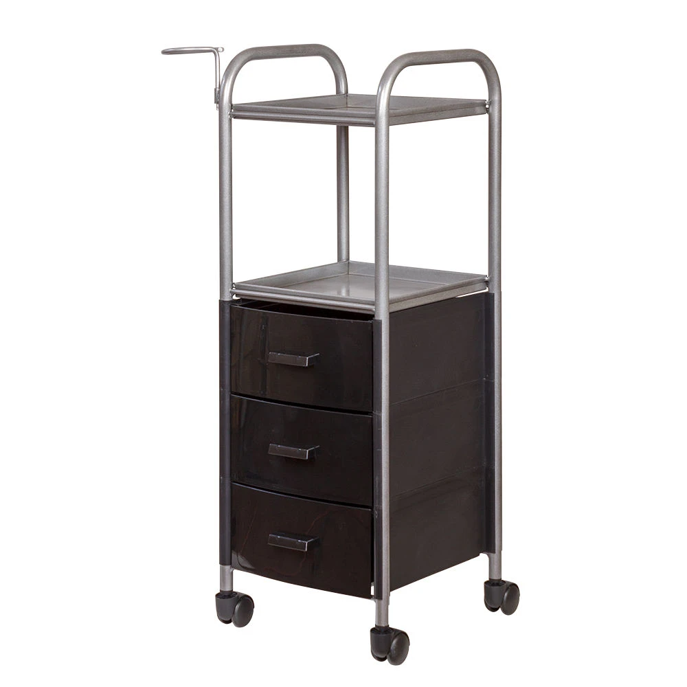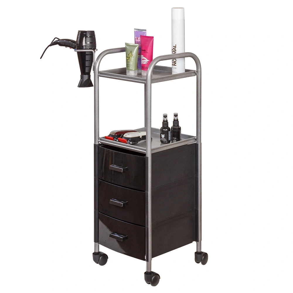 На двух полках достаточно места, что расставить инструменты, аксессуары и расходные материалы первой необходимости. В трех ящиках много места для хранения остальных приспособлений. Удачное дополнение парикмахерской тележки – удобный держатель для фена на боковине. Благодаря встроенным колесикам можно передвинуть тележку в нужное место.