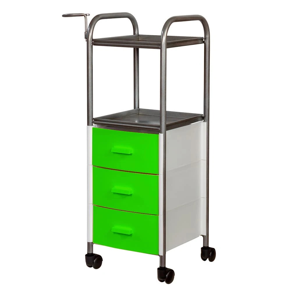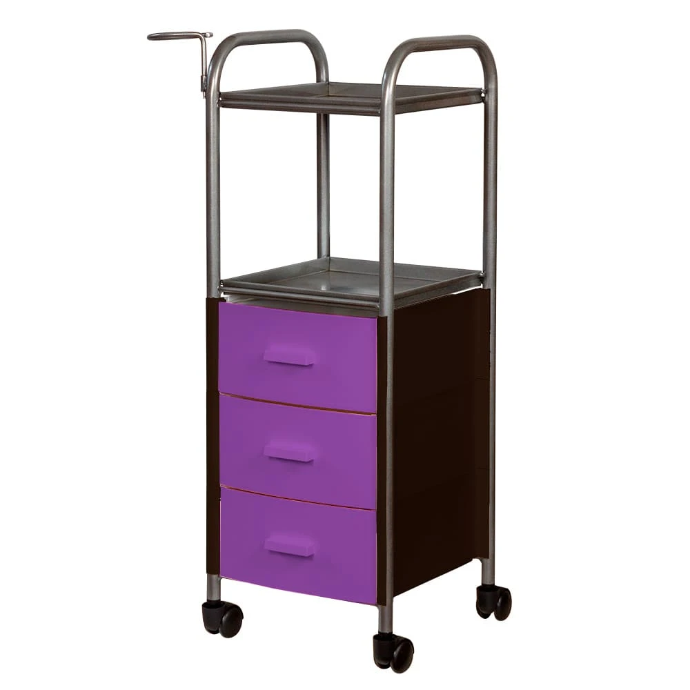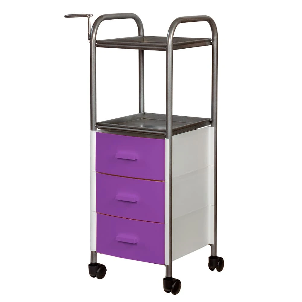 На двух полках достаточно места, что расставить инструменты, аксессуары и расходные материалы первой необходимости. В трех ящиках много места для хранения остальных приспособлений. Удачное дополнение парикмахерской тележки – удобный держатель для фена на боковине. Благодаря встроенным колесикам можно передвинуть тележку в нужное место.