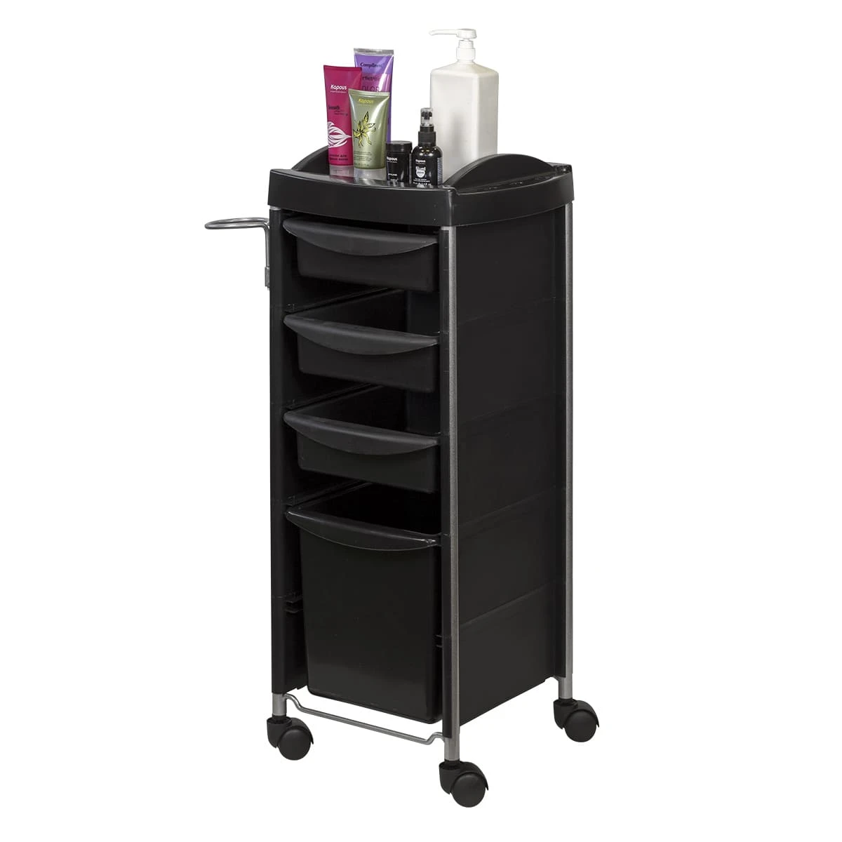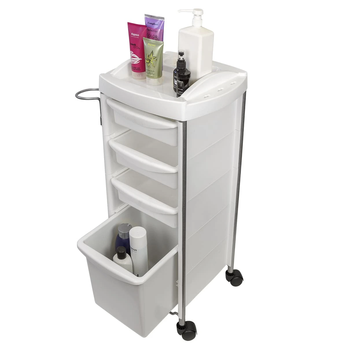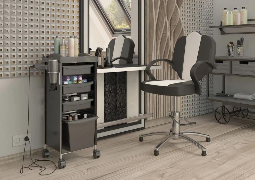 Каркас парикмахерского оборудования выполнен из металлических труб. Ящики, полка и боковины изготовлены из прочного пластика. Материал не деформируется при случайном попадании косметических средств, хорошо переносит регулярную чистку и дезинфекцию. Колеса из качественного пластика не оставляют царапин на полу и обеспечивают бесшумное перемещение оборудования.