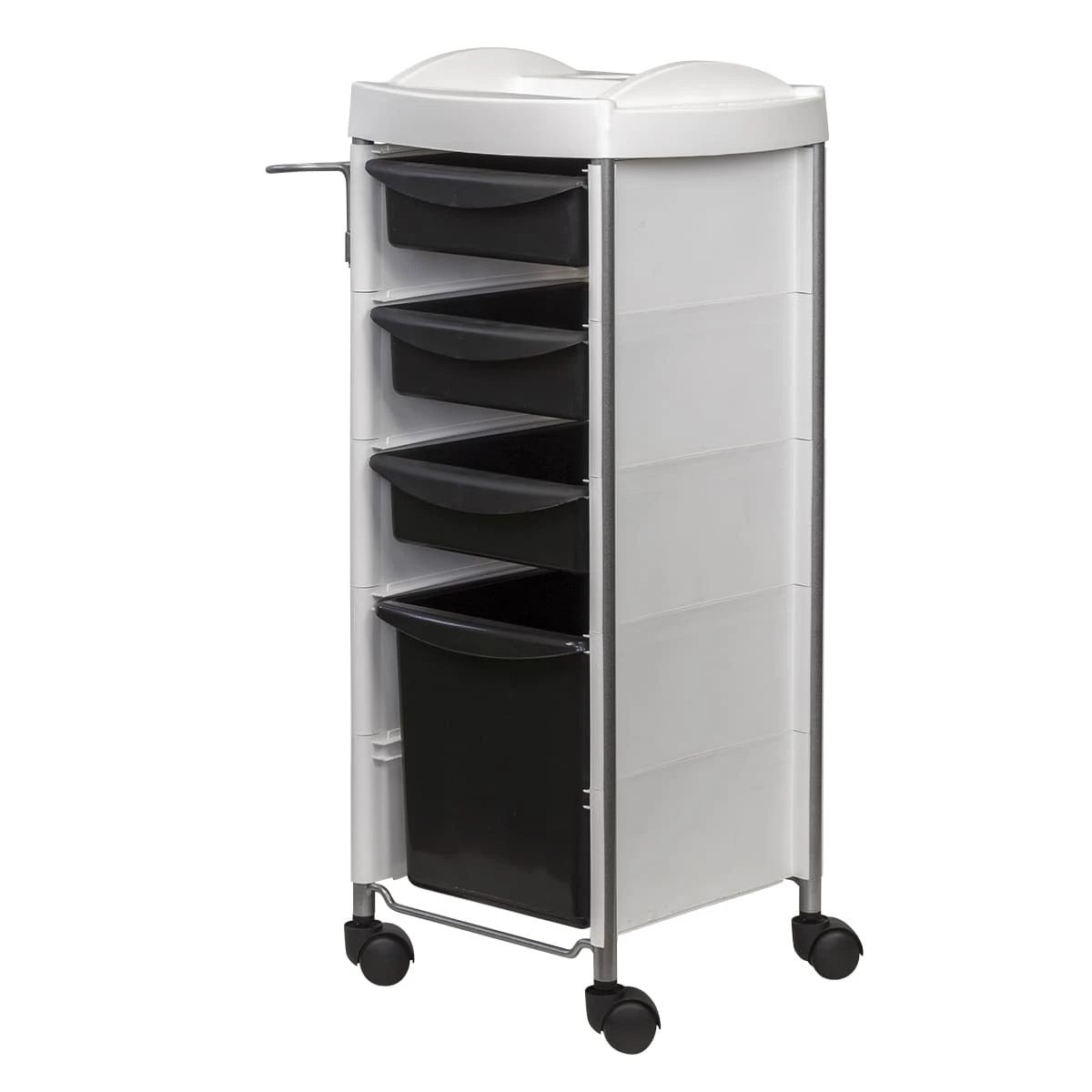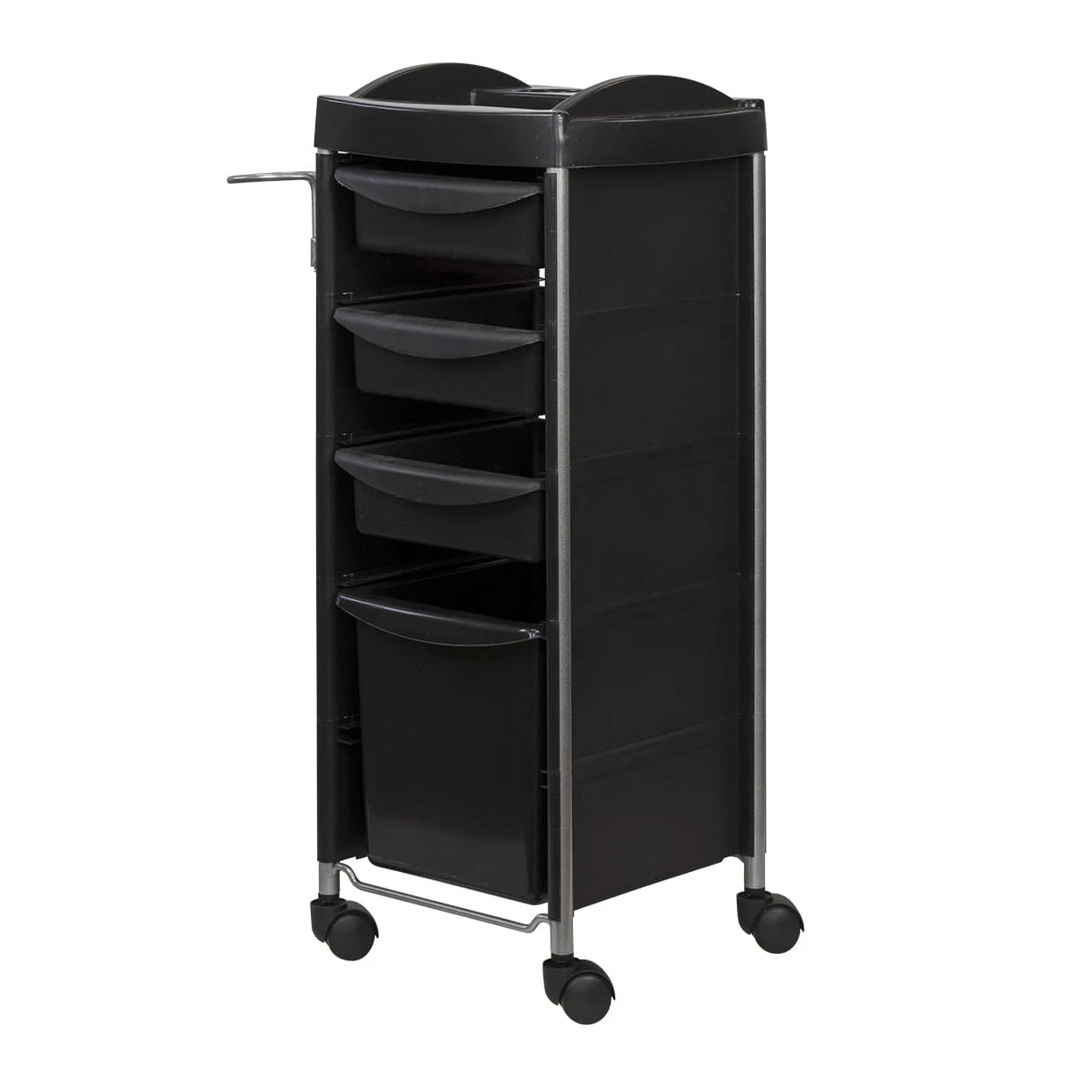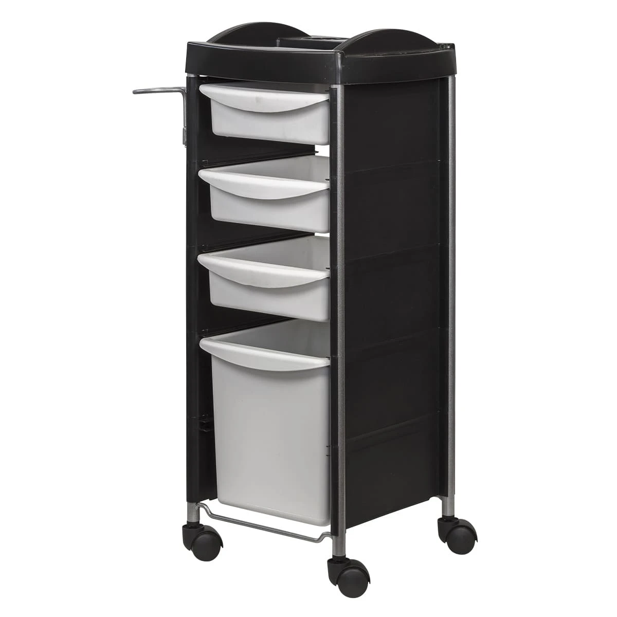 Каркас парикмахерского оборудования выполнен из металлических труб. Ящики, полка и боковины изготовлены из прочного пластика. Материал не деформируется при случайном попадании косметических средств, хорошо переносит регулярную чистку и дезинфекцию. Колеса из качественного пластика не оставляют царапин на полу и обеспечивают бесшумное перемещение оборудования.