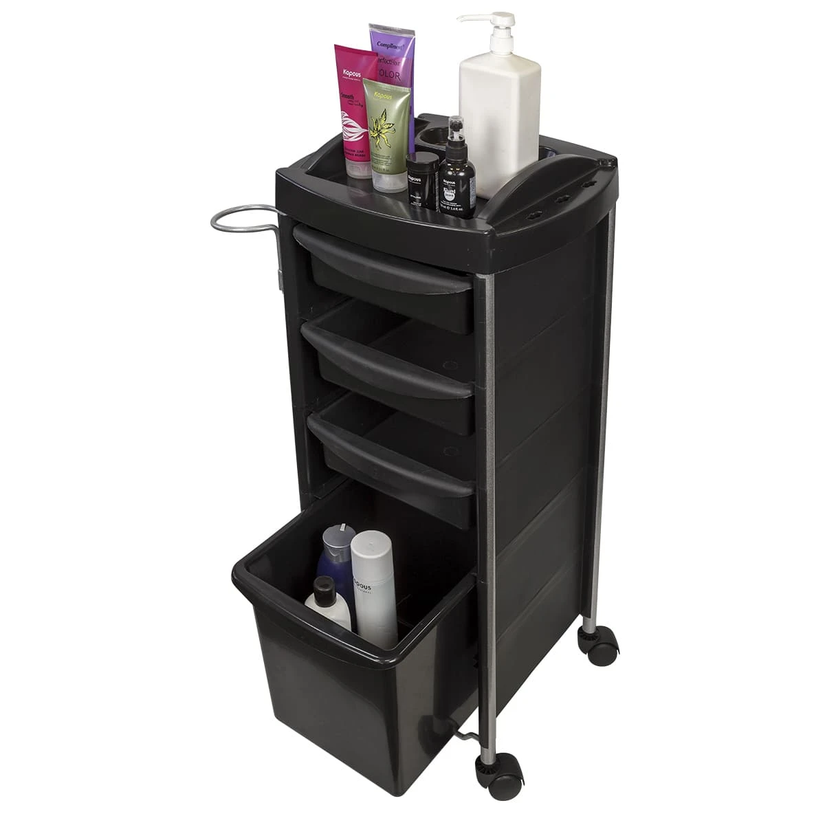 Хорошо продуманная конструкция без лишних деталей позволит мастеру хранить рабочие приспособления в одном месте. На верхней полке высокие бортики и углубления, что предотвратит выпадение косметических средств. На боковой стороне есть держатель для фена.Нижний большой ящик может быть использован в качестве бака для отходов после процедур.