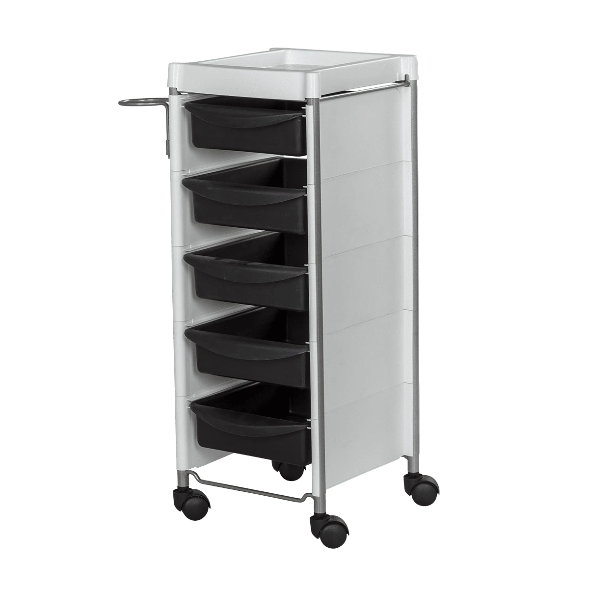 В каталоге нашего магазина Вы можете подобрать и купить парикмахерскую тележку М-04 в черном или другом цвете на выбор. Модели одной серии отличаются только цветом выдвижных ящиков: черный, фиолетовый, зеленый, оранжевый, красный, белый и серебристый.