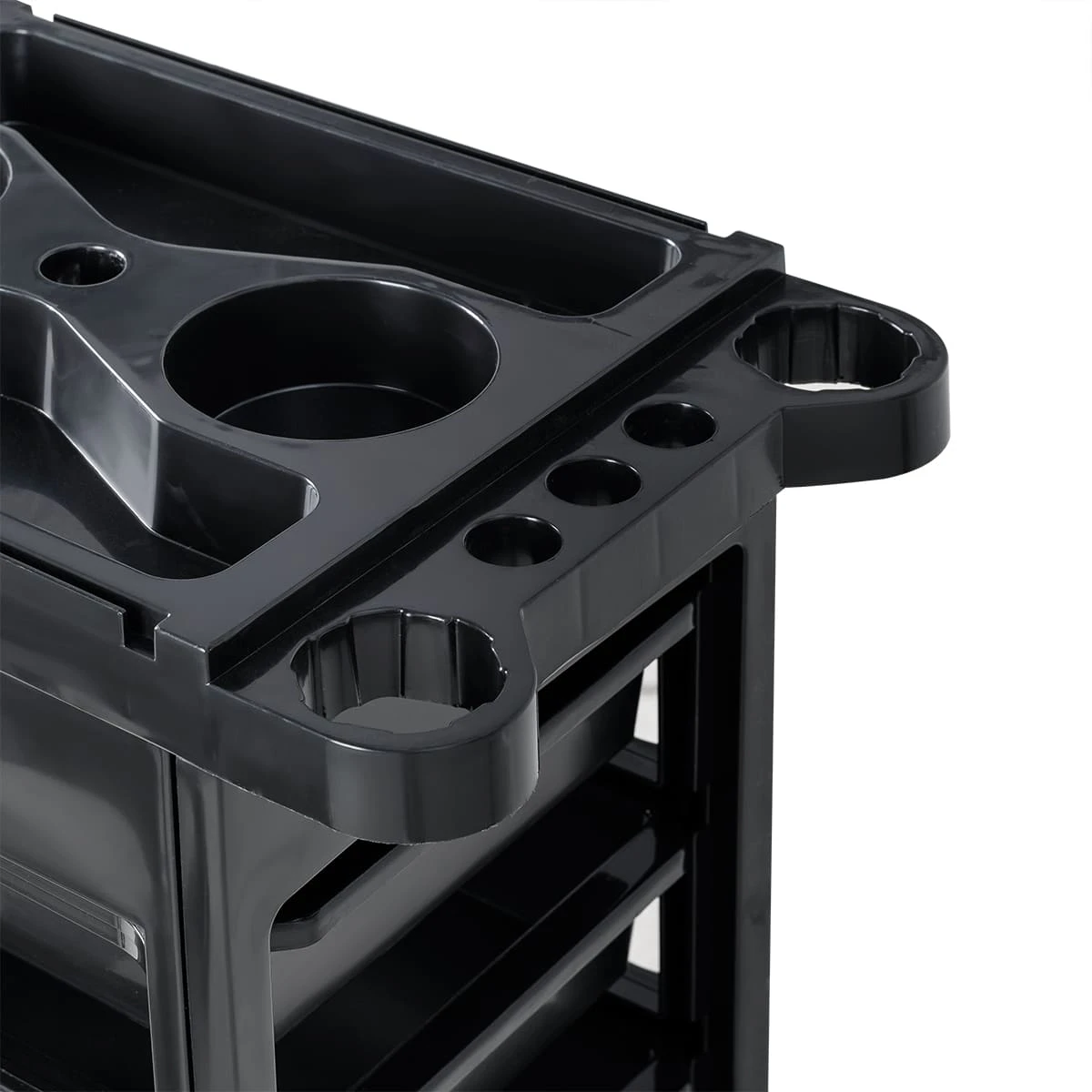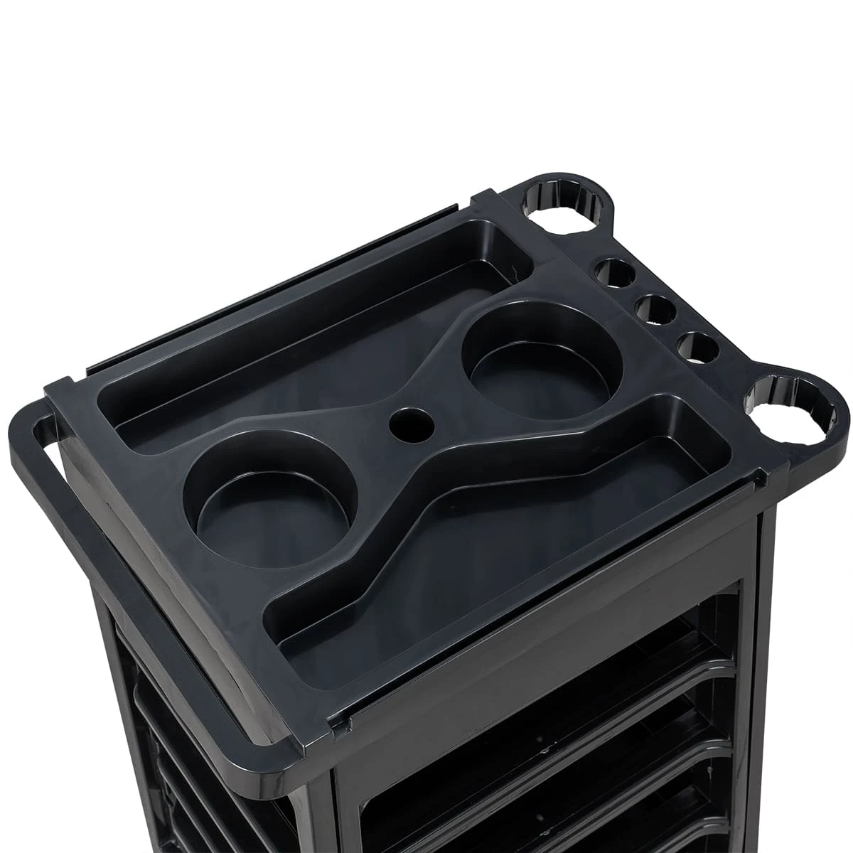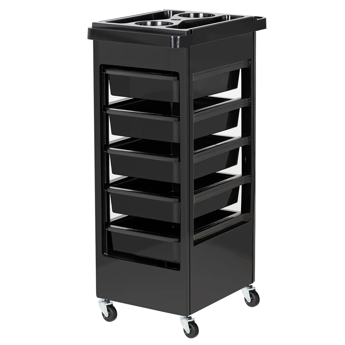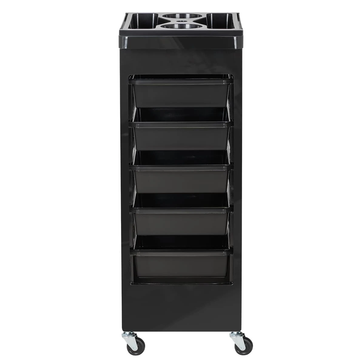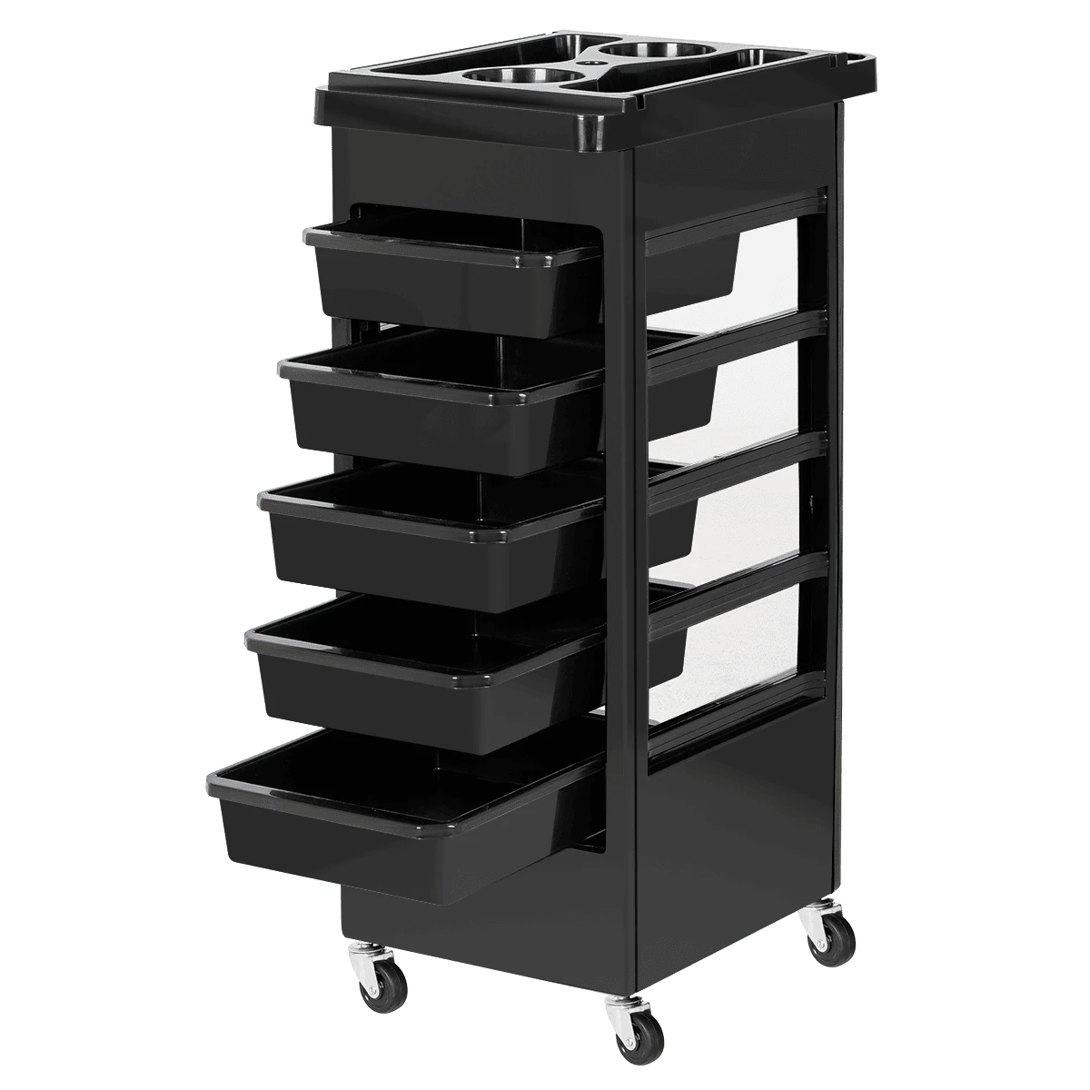 Комплектуется пятью выдвижными ящиками. В верхней крышке есть отверстие для фена диаметром 60 мм. Колеса резиновые в металлическом каркасе.