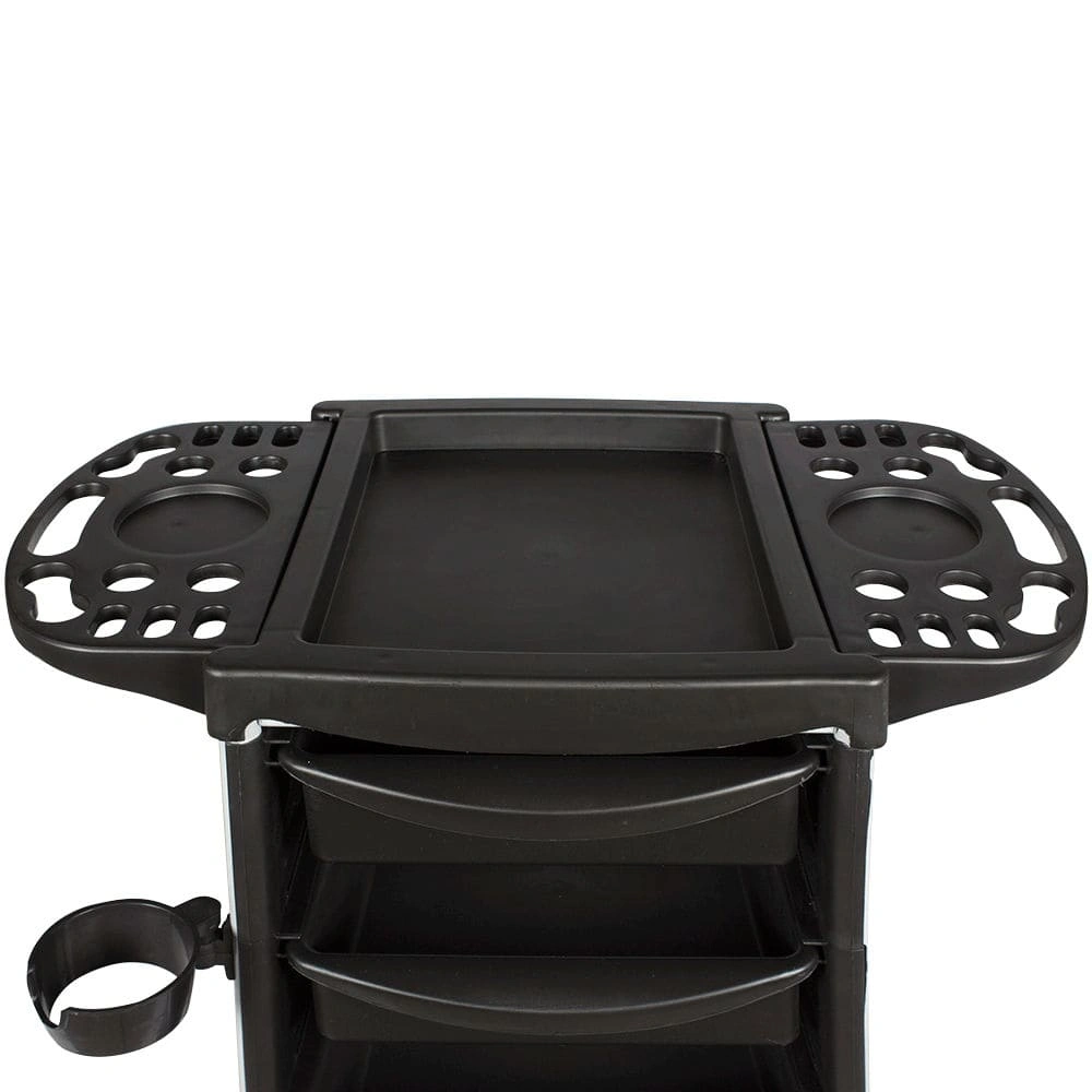 Дополнительную функциональность тележки обеспечивают боковые полки, прикрепленные к верхней крышке. В них предусмотрены отверстия разных размеров для размещения брашингов. По желанию мастер может сложить полки или одну из них, если на данный момент они не используются. При хорошей вместительности тележка занимает минимум пространства: