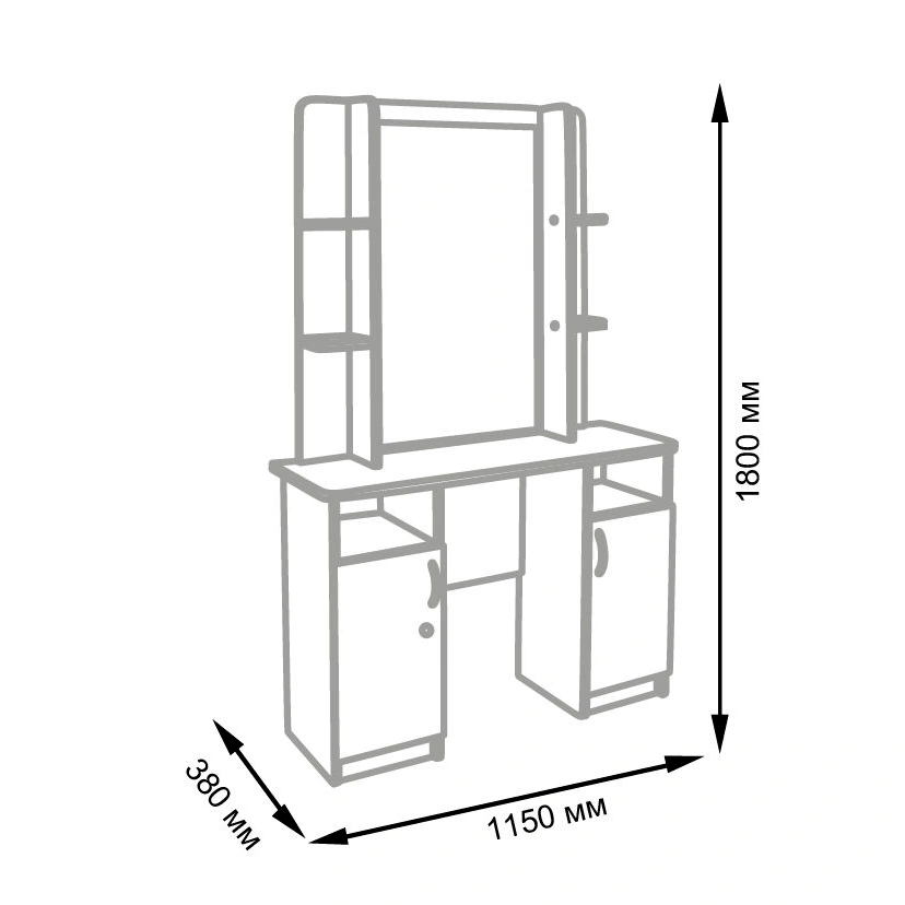 Для удобства по бокам от зеркала установлены полки на всю высоту. Также в комплектацию входит две тумбы с открытыми полками и закрытыми отделениями с дверками. Каждая дверка закрывается на ключ, что обеспечивает надежное хранение ценных приборов и инструментов. Зеркало является очень устойчивым и не требует дополнительного крепления во время установки. Его размеры: