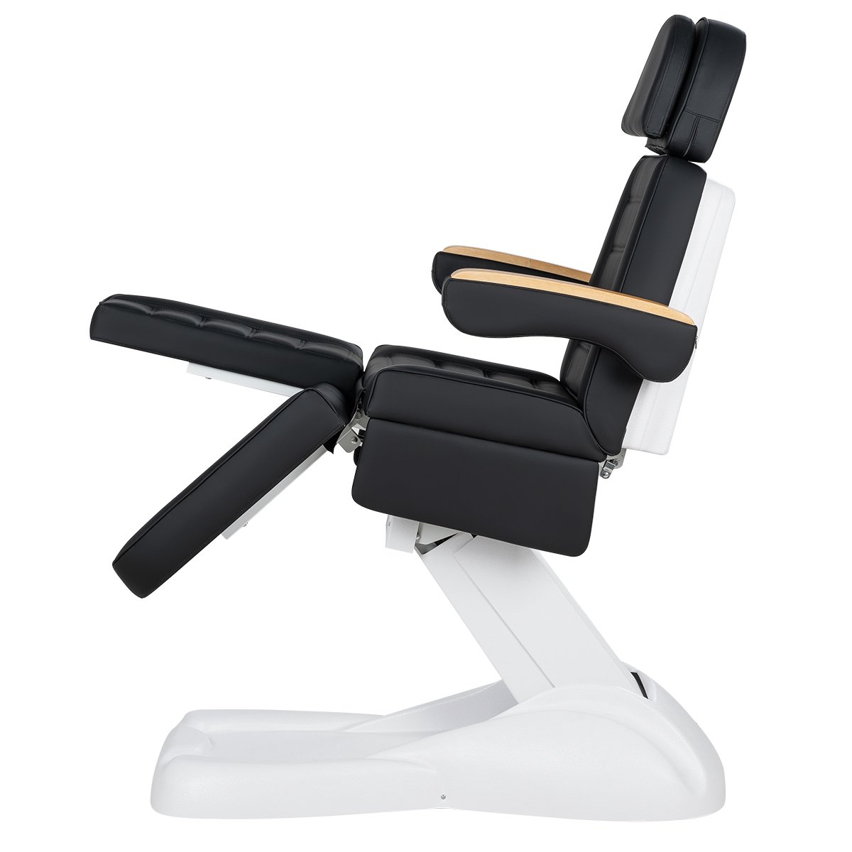 Кресло имеет устойчивое широкое основание, конструкция полностью раскладывается в горизонтальное положение, имеются выдвижной подголовник с отверстием для лица, которое при необходимости можно закрыть мягкой подушкой и съёмные подлокотники со стильными деревянными вставками. Модель можно использовать для различных процедур: педикюр, наращивание ресниц, косметология, оформление бровей и т.д.