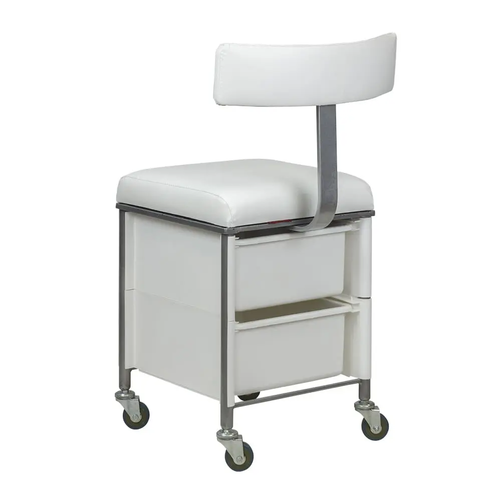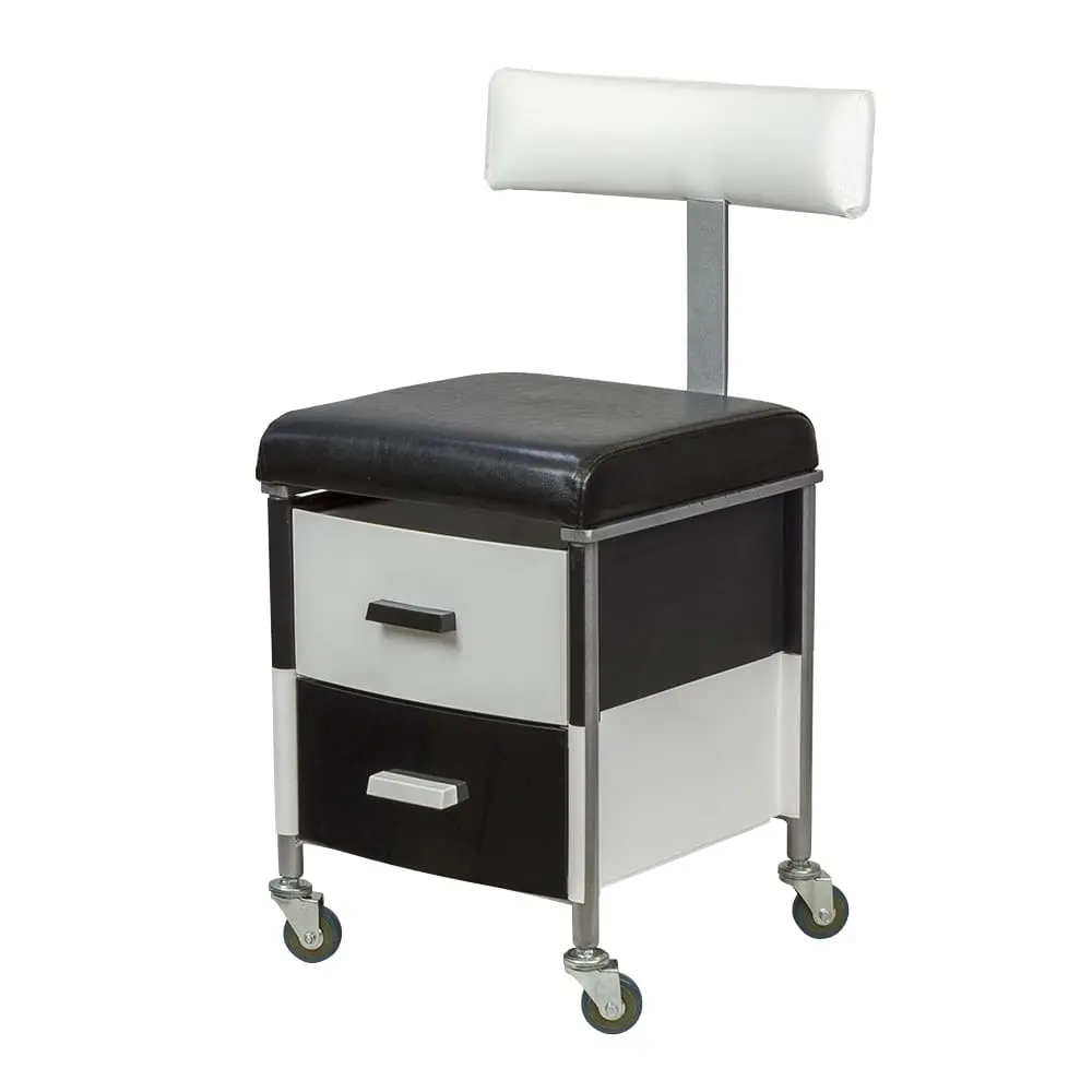 Стул укомплектован двумя выдвижными ящиками, где мастер может держать необходимые для работы инструменты и расходные материалы. Наличие мобильных колес позволит беспрепятственно перемещаться по рабочей зоне. При необходимости колеса можно зафиксировать специальными тормозами на каждом колесе.