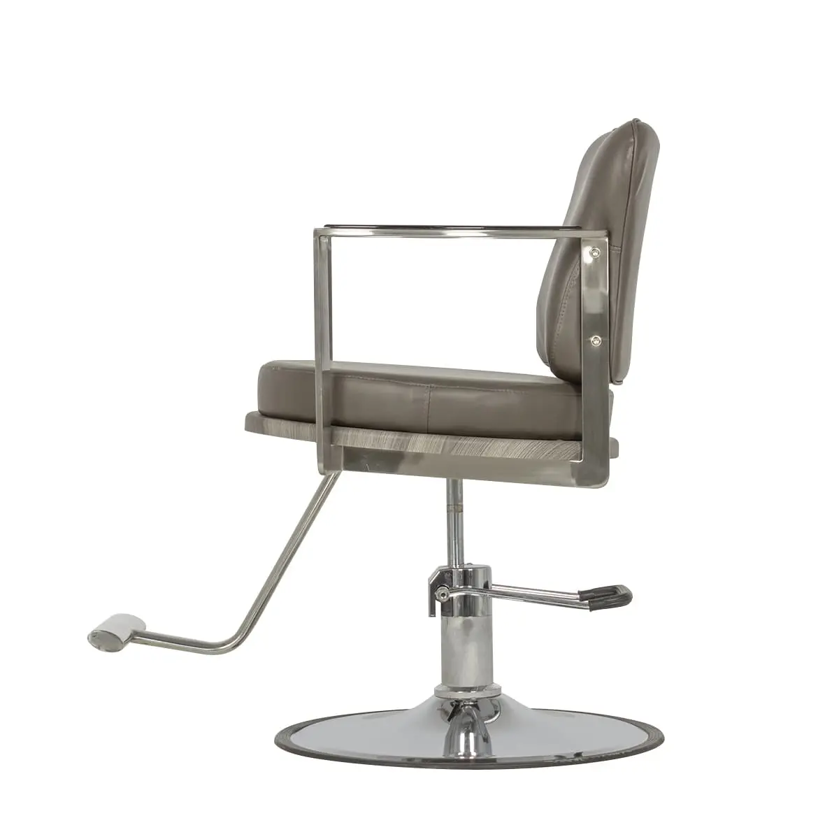 Каркас парикмахерского оборудования выполнен из прочного металла и установлен на устойчивую круглую базу из хромированной стали. Каркас из металла надежен и выгодно подчеркивает стиль кресла. Для предотвращения скольжения и царапин на полу, на основании предусмотрена качественная резиновая накладка.