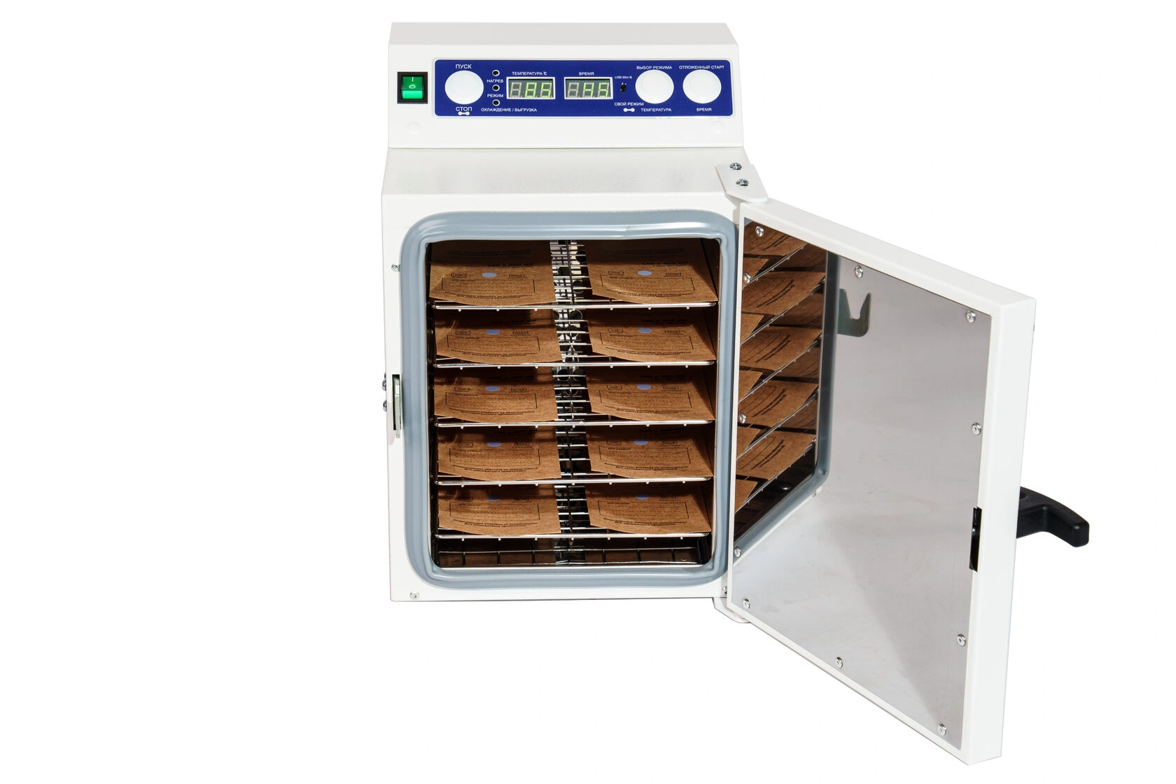 Стерилизационная камера разработана методом компьютерного моделирования, с целью достижения максимального нагнетания воздуха, что позволяет располагать инструмент в стерилизационной камере на 5 полочках одновременно.
