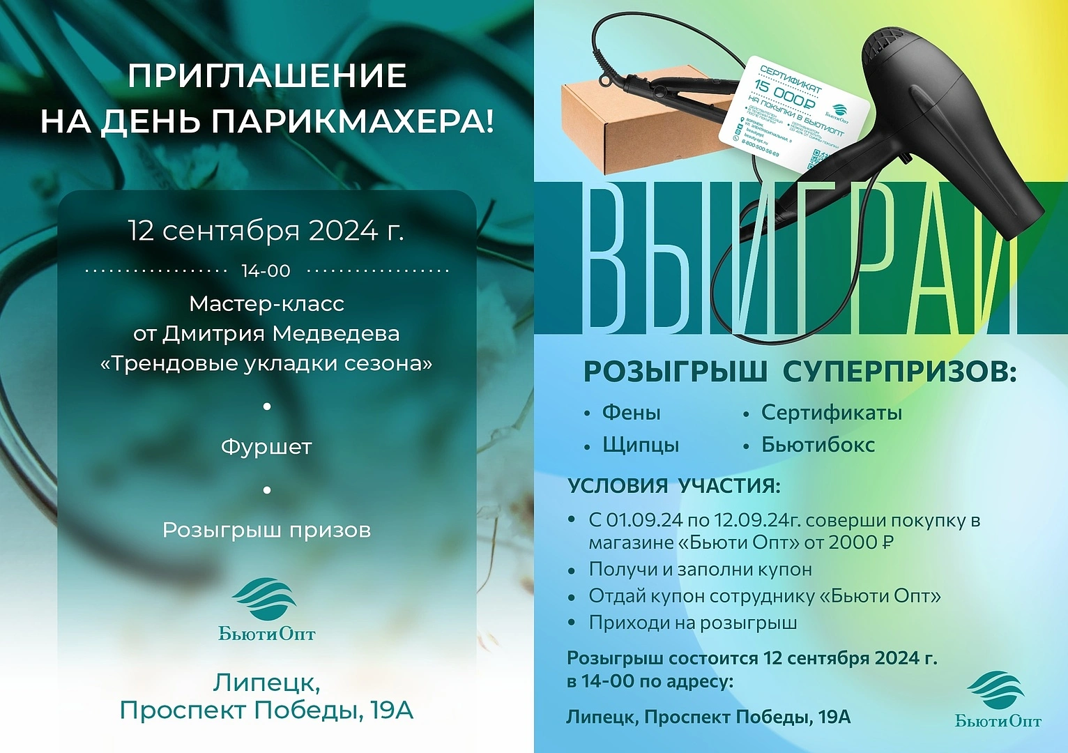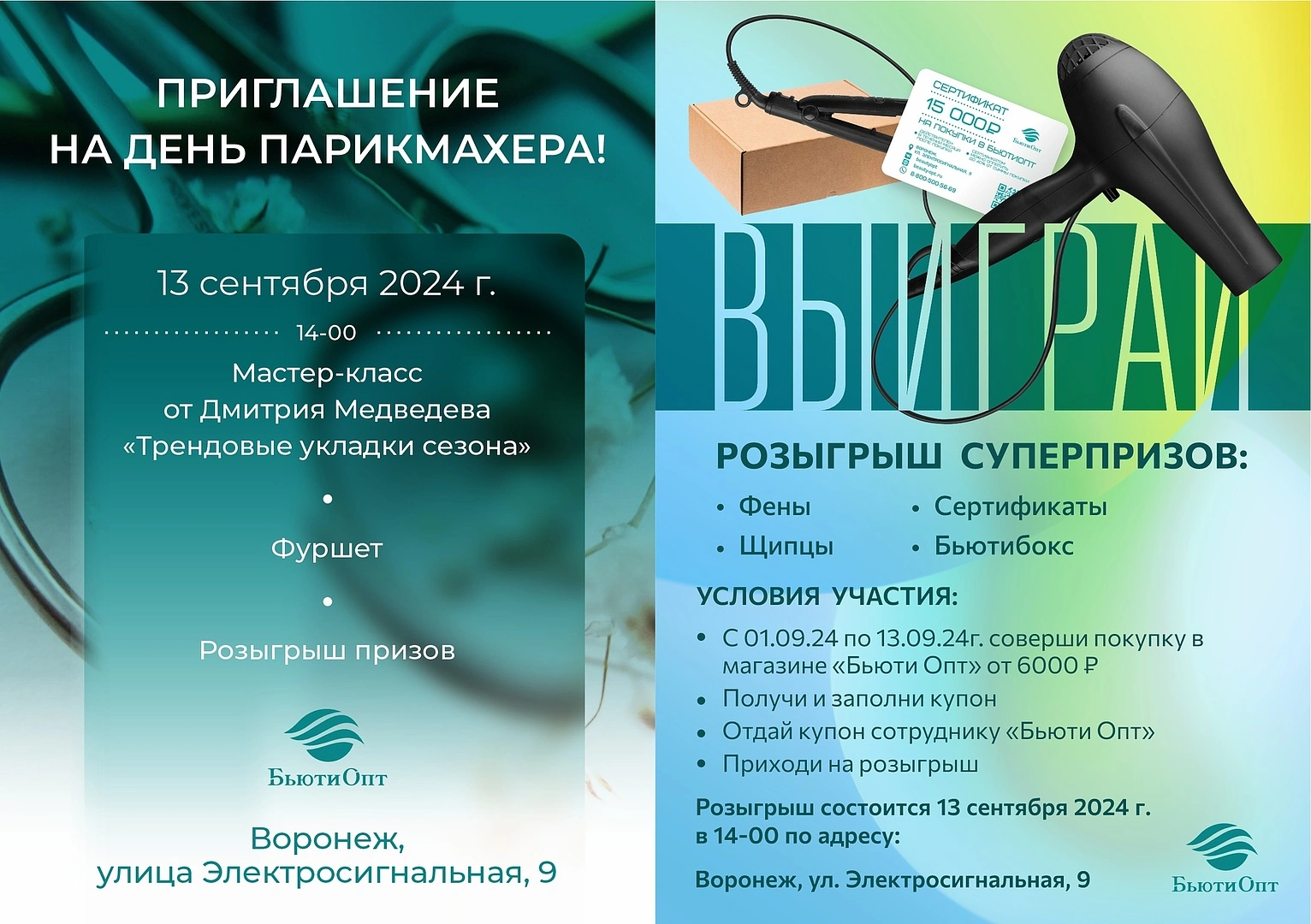 В честь дня парикмахера для посетителей выставочного зала в Воронеже и Липецке всю неделю с 09.09.2024 по 13.09.2024 действует спецпредложение по оборудованию: