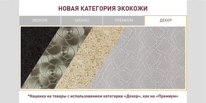 1) Мы ввели новую категорию Декор, в которой собрали экокожу с какими-либо элементами выработки на коже (термостежка, узор, прошивка, фактура)